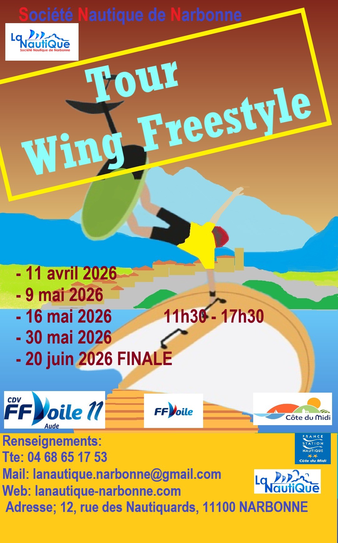 L’actu compétition à venir, ce sont 5 dates à retenir pour un championnat Frestyle wing bien sympathique à La Nautique. Le Pôle voile narbonnais met un gros coup de boost cette saison pour mettre en avant la discipline avec des évènements tout au long du printemps pour les riders cascadeurs qui veulent se tirer la bourre sans prise de tête. Encore une belle initiative du team déjà à la barre des compétitions windsurf locales au programme également courant 2026. Une équipe au top qui vous attend dès maintenant! Infos > lanautique.narbonne@gmail.com / 04 68 65 17 53 🙂