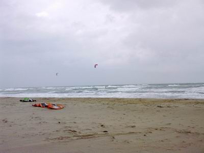 En arrivant aux pilotis, il ne fallait pas tenir compte de la température fraîche mais plutôt du vent (qui manquait encore de force par rapport aux prévisions) et des vagues qui allaient tous les 2 prendre des tours dans l’après midi. Le marin va progressivement monter pour atteindre un moment un bon 25 nds et les barres se montreront sérieuses par endroit avec de quoi se faire du dénivelé au surf . Vous rajoutez une orientation plutôt Est/Sud-Est, une trentaine de kites, une poignée de windsurfers (dont Nicolas « F400″Akgazciyan), vous secouez le tout et vous obtenez une après-midi de dimanche marquant le début d’un flux de marin qui devrait tenir les prochains jours…