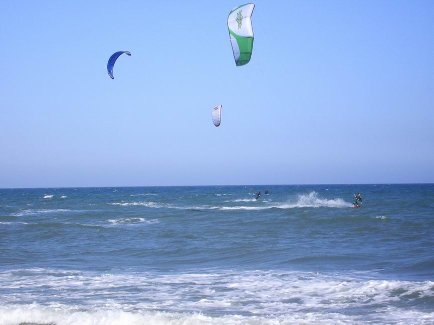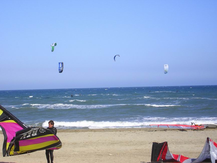 Pendant que le Mondial du vent continuait son déroulement avec aujourd’hui de la longue distance amateur et PKRA (pas de freestyle pour cause de marin trop déventé sur la zone de tir), on profitait du courant de Sud-Est de Leucate plage à Argelès où le vent se renforçait au fur et à mesure que l’on remontait vers la frontière espagnole. 18/20 nds sur le spot des pilotis donc, 20/25 nds sur les spots de Barcarès et 30 nds sur la zone de Canet/Saint Cyprien.