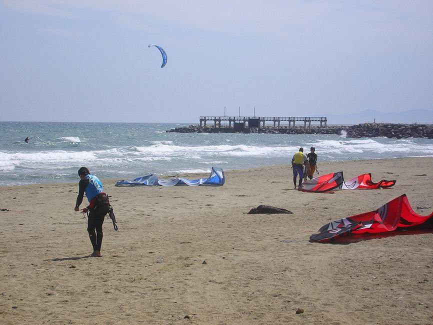 Quelques photos prises un peu après 14 heures aux pilotis où les kites en 9 m2 et plus et les windsurfers en 5m2 minimum étaient déjà nombreux. J’y ai retrouvé Nico Rasta, Antoine, Cristo, Nico Electro, Rzbo et de nombreux autres habitués avant de partir en 9m2 avec Jean-Marie et Olivier qui testait la 7 m2 Flow et la Venom pour une petite remontée vers Barcarès bien aidés par une orientation Est/Sud-Est du marin à 20 nds qui forcira à 25 nds au fur et à mesure de notre balade dans la houle. Passage au large des spots de L’Aqualand, des trois colonnes (où Filaïp photographiait et naviguait en compagnie notamment de Stef’, Yannout et Jean-Mi) pour finir à la sortie de l’Agly où Annie et André windsurfaient en 5,3 et 5 m2). Après une petite pause, retour à Leucate en surfant la houle dans un vent finalement constant sur cette zone alors que plus au Sud, du côté de Canet, les kites en 7m2 semblent avoir été majoritaires dans un vent plus soutenu.