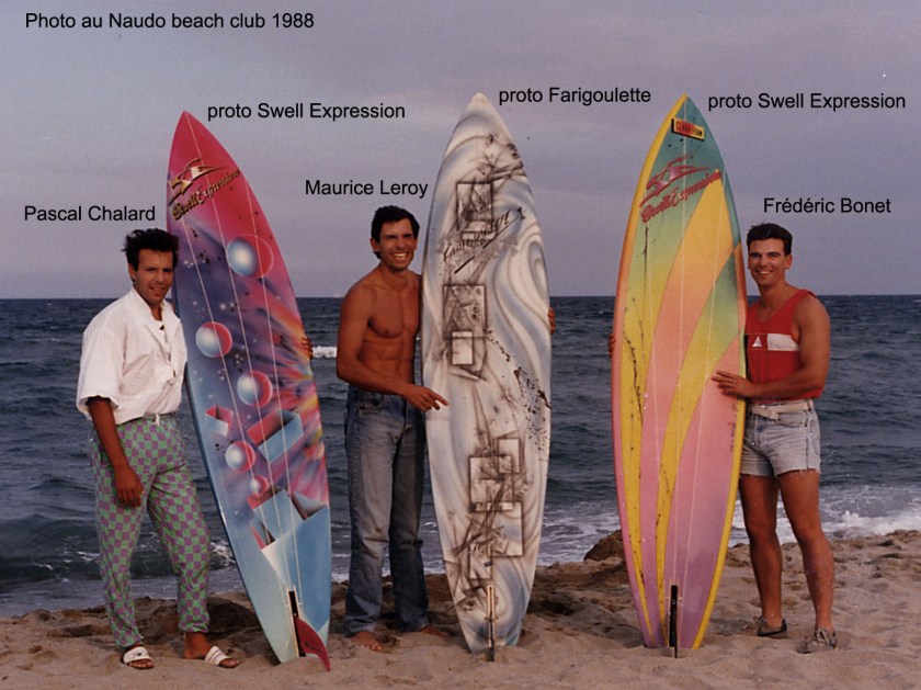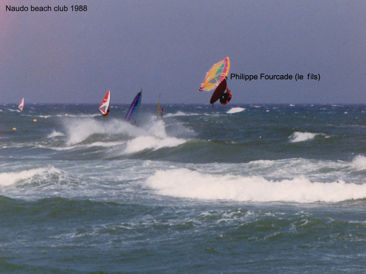 Ces windsurfers, qui avaient autour de 25 ans à l’époque, ont pour nom Pascal Chalard, Maurice Leroy, Georges Parès, Philippe Fourcade (le fils) et bien sûr Fred Bonet. Ils planchaient sur des customs de marques prestigieuses à l’époque, comme Farigoulette et Swell Expression, avec des voiles qui ont marqué leur temps comme les Gaastra Wave Foil Pro (souvenez vous: « ADTR tested » avec le dessin du gréement attaché à la Jeep) et les North Ezzy…