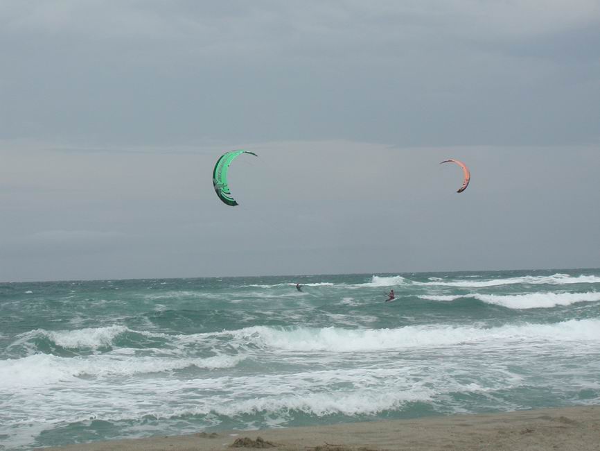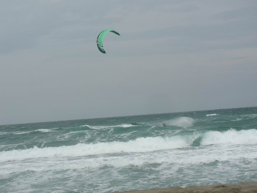 Encore de belles conditions en fin d’après-midi et seulement 3 à l’eau en 9m2 pour prendre le relais de ceux qui se sont régalés quelques heures plus tôt le plus souvent en 7m2 en kite et 4,5/4,7 m2 en planche. La montée d’une grosse bande de nuages au dessus des corbières a, semble-t-il, correspondu avec la baisse du vent mais auparavant, les éclaircies de fin de journée ont donné des couleurs d’eau magnifiques, donnant à la navigation une lumière rare.