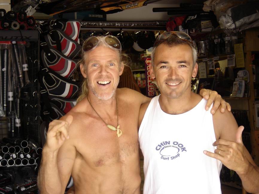 Alors là ATTENTION !!! Moi je dis…Légende vivante ! Ce matin, Jean-Marie Devaux est passé au shop comme cela lui arrive souvent sauf que cette fois, il était accompagné d’un de ses amis de passage et en bivouac à la poussada. Hors, il se trouve que cette souriante personne n’est autre que Monsieur Mike Eskimo himself !! LE windsurfer qui a fait rêver toute une génération de planchistes il y a « quelques » années, à une époque où l’on ridait Hookipa avec des voiles en mylar, des customs asymétriques et où le sieur Eskimo partageait les vagues avec Greg Maisonville, Fred Haywood, Mark Angulo, le jeune Robby, Ken Winner et autre Mike Waltz. Oui, je sais, ça fait un peu vieux con mais étant gosse, j’avais des posters de Mike Eskimo dans ma chambre et le sens de la communication qui a fait en partie son succès a rempli des dizaines de pages de magazines y compris généralistes où il se mettait en scène pour des photos de wave riding, marquant pour longtemps l’esprit des windsurfers de la fin des années 80.