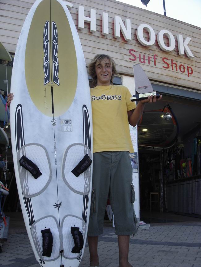 Prenez le cas de Samuel Ruel. Ce jeune windsurfer leucatois, au demeurant souriant mais néanmoins sans gêne, vient il y a peu demander un soutien auprès du shop pour aller disputer le Championnat du monde de Slalom junior au lac de Garde du 7 au 13 juillet dernier. On lui confie une RRD X fire LTD 105 L et que fait ce jeune effronté ? Il gagne sa classe d’âge et se trouve donc champion du monde de slalom pro kids IFCA des moins de 15 ans !!!