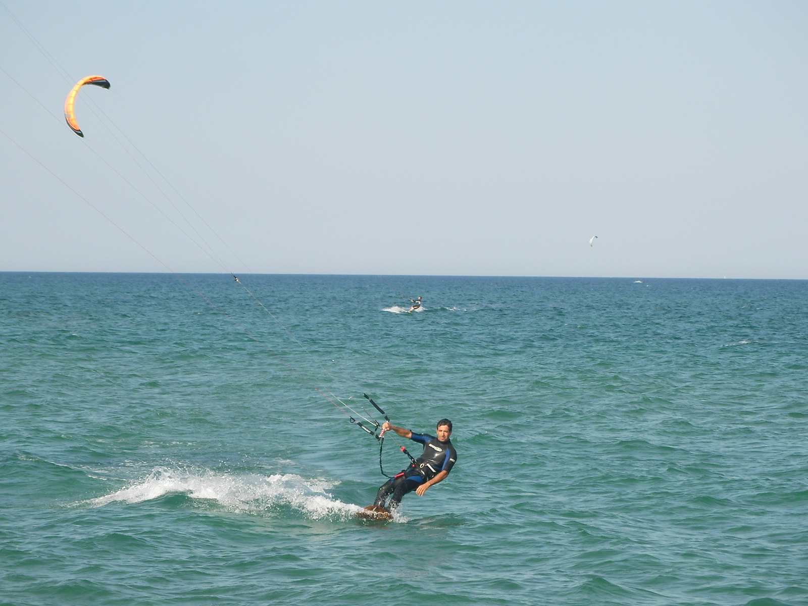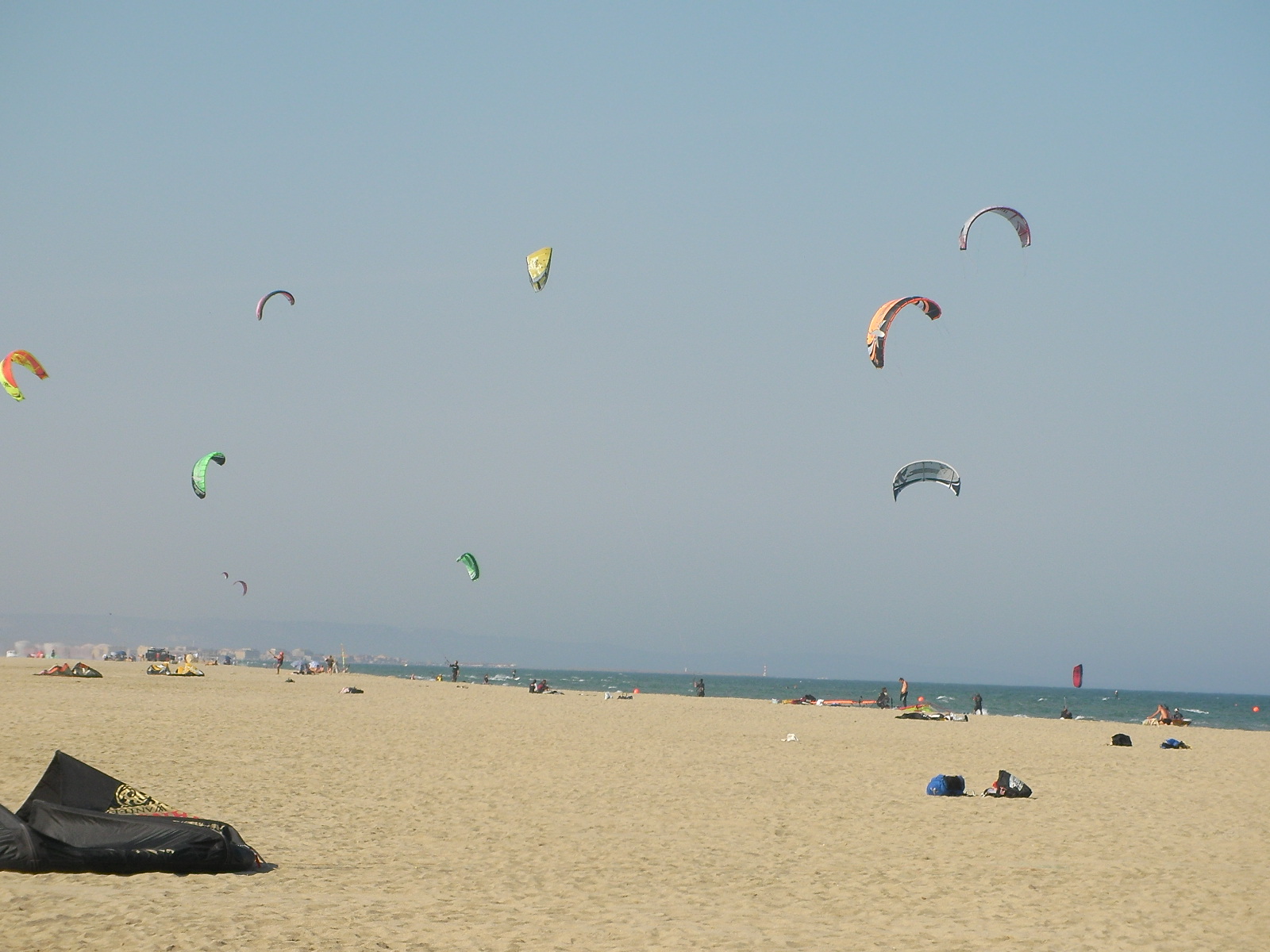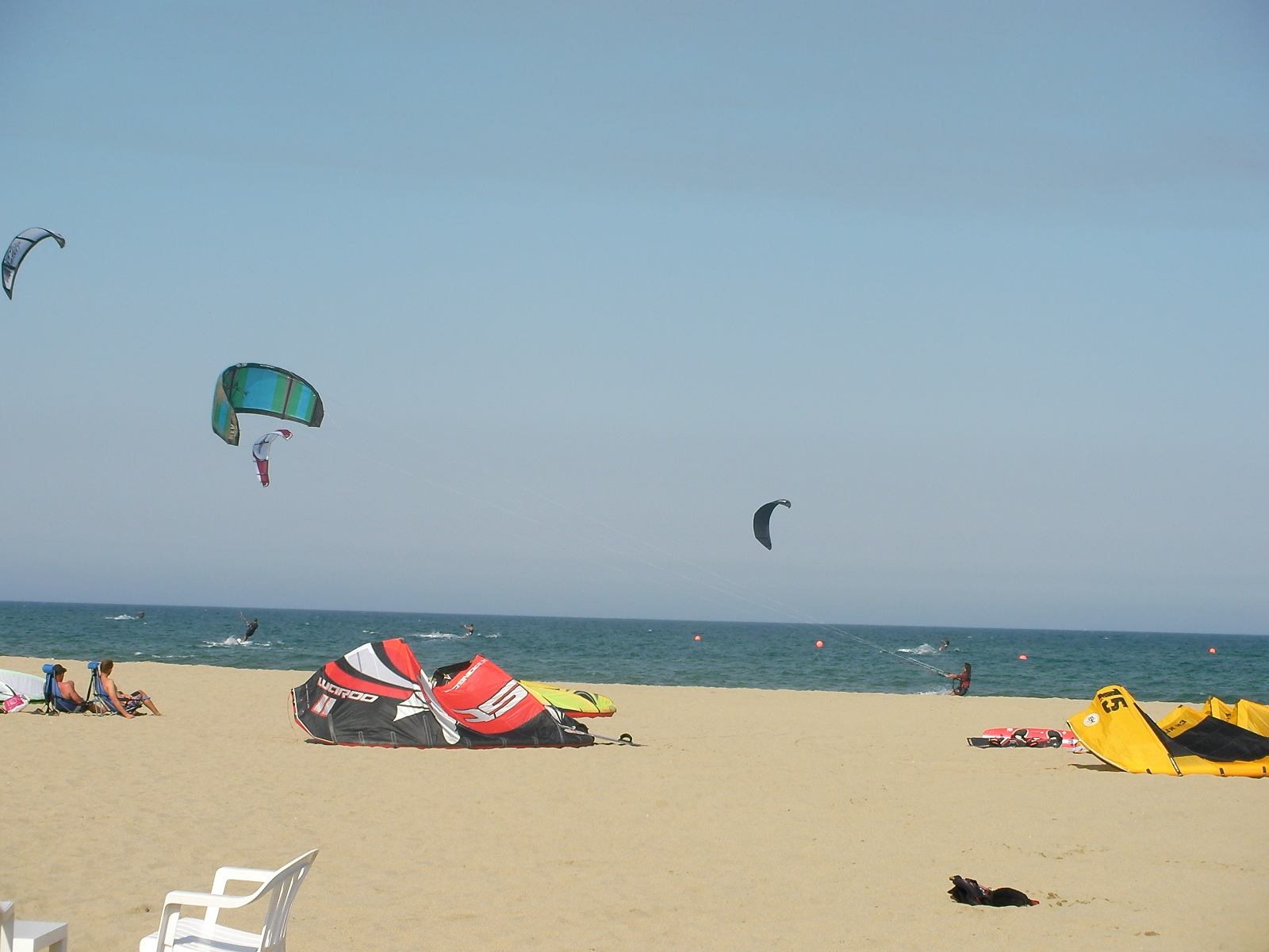 Petit thermique sur le sud de la zone ce jeudi avec un vent de Sud-Est léger entre Canet et Argelès. Encore de nombreux estivants pour profiter d’une journée très ensoleillée et chaude. Une vingtaine d’ailes au pont des basses et 4/5 à Saint Cyprien dont celles de Luc, Marc, Julien et François. 12 m2 et grosses boards pour les kiters et 7,5 m2 minimum + planche de race pour les windsurfers.