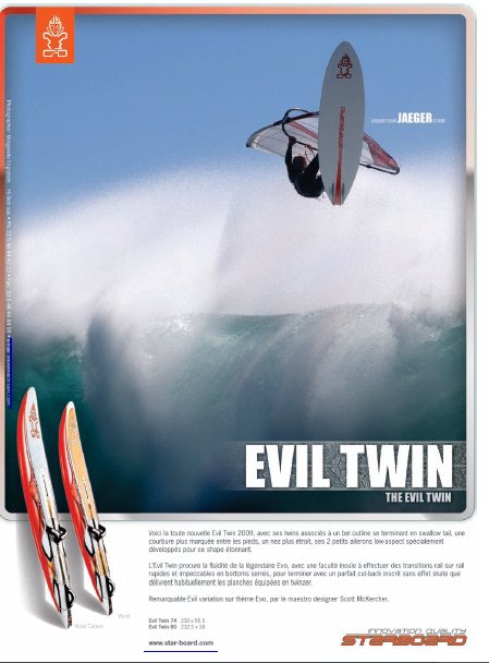 Shape et tendance inédite chez Starboard pour la première gamme twin fins de la marque. Le Tiki propose pour 2009 sa version du surfriding dernière génération avec les Eviltwin 74 et 80.