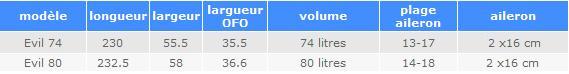 2 technologies proposées: Wood et Wood Carbon (décrite plus haut) pour la Eviltwin 74 (2,30/55,5) et Eviltwin 80 (232/58,5 ) livrées avec 2 ailerons de 16 cm