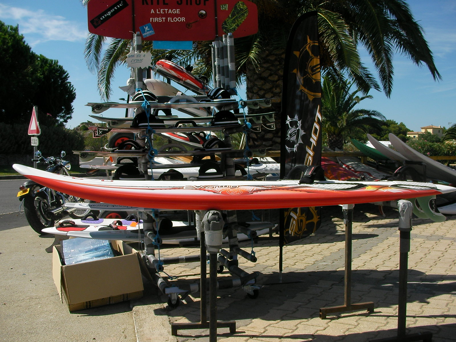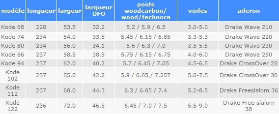 La gamme est partagée en 3 familles: Wave riding 68/74/80 avec amortisseurs, doubles inserts et doubles sandwichs. Wave riding/Freestyle 86/94/102 sans amortisseur pour un poids mini + inserts inter./exter. Free slalom 112/122 avec « cut aways », nouveaux ailerons plus rapides et inserts inter./exter.
