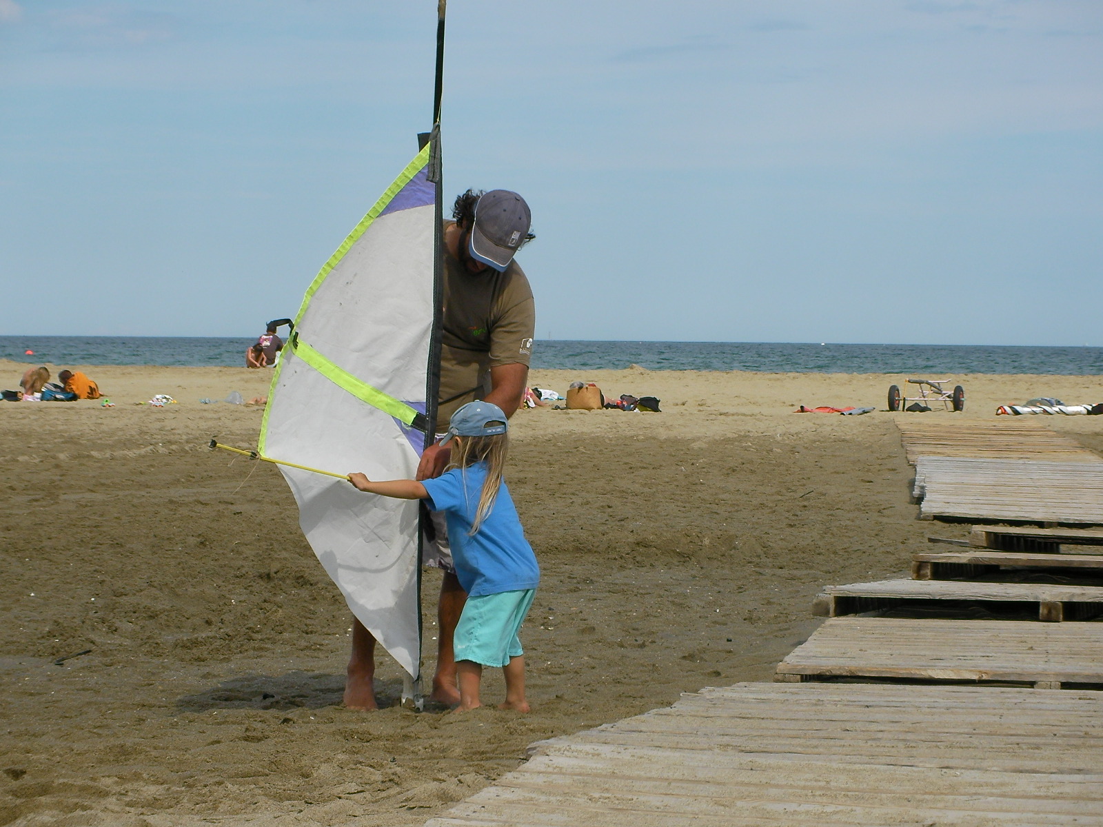 Pas assez de vent pour les grands à Leucate ce dimanche mais suffisament pour un petit homme qui se fait la main sous les conseils de son papa Christophe du CVCL venu en renfort pour son bout de chou. Le gréement est encore de fortune, les gestes sont mal assurés mais dans quelques années…