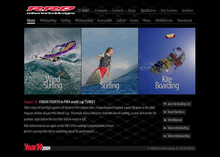 Et voilà le plus beau. Roberto Ricci met à jour son site web avec la version « Year 14 » soit le millésime 2009 de la marque italienne. Au menu, windsurf, kitesurf, fashion, surf et même yachting (!) pour savourer l’étendu du talent du shaper-designer. Ue fois de plus, Roberto ne lésine pas le visuel tant pour les images que pour le matériel.