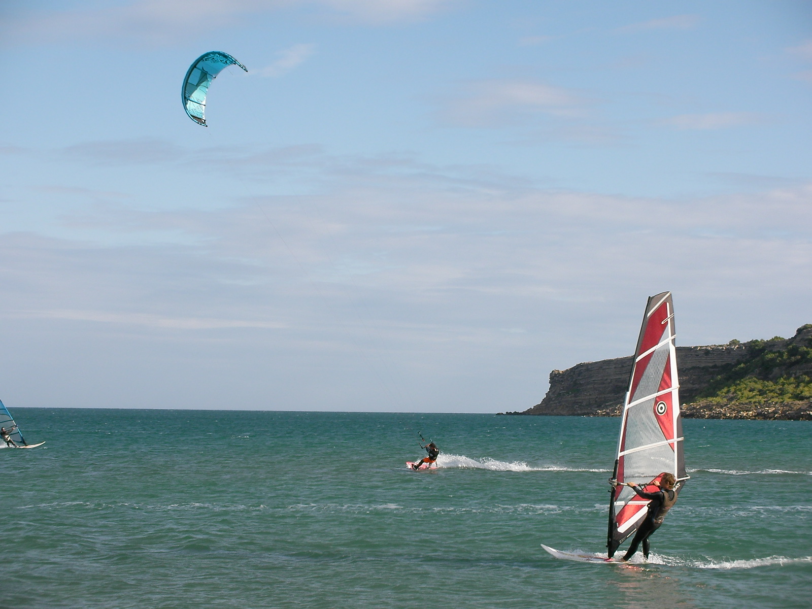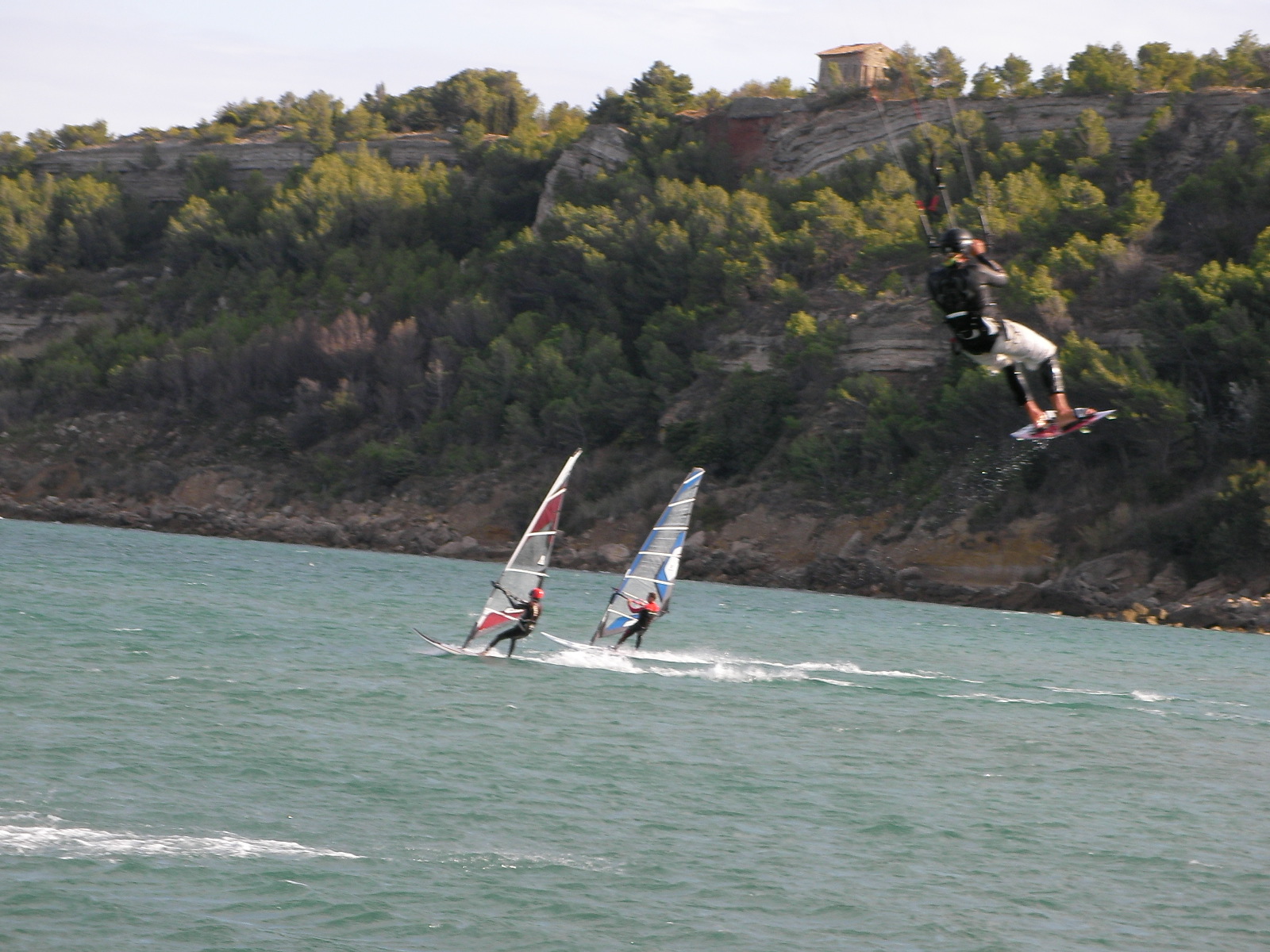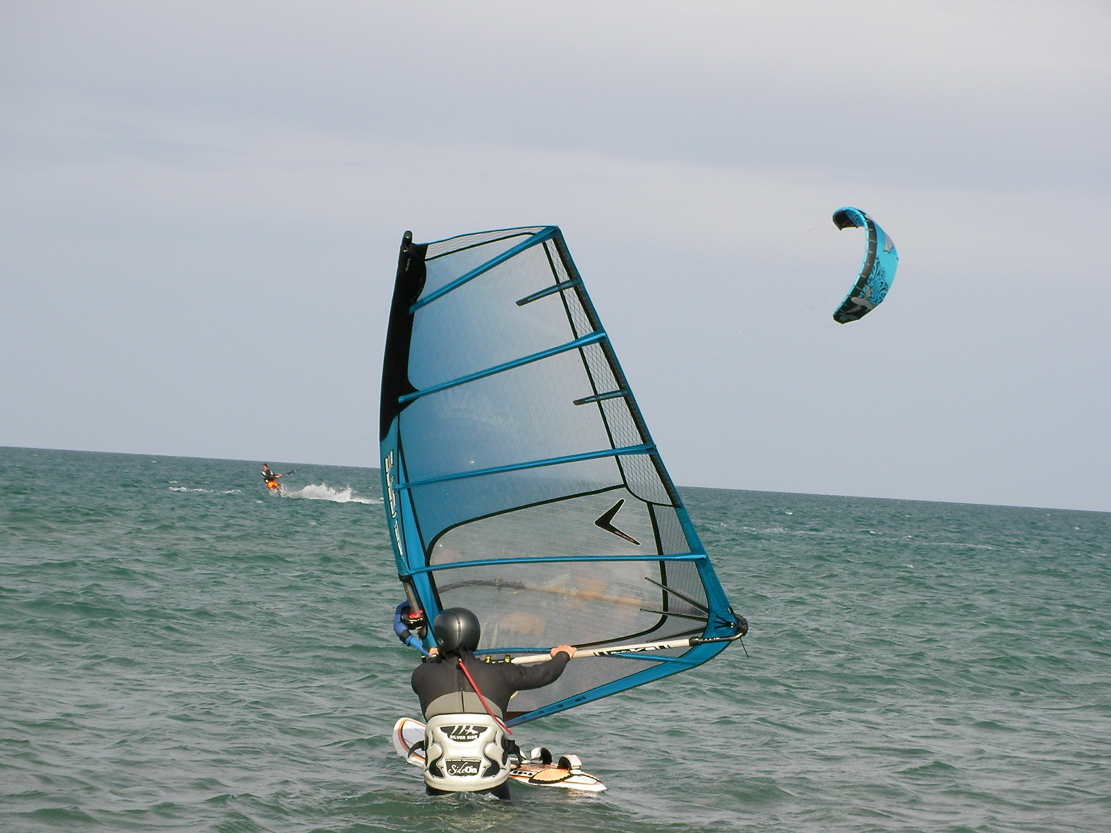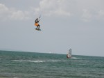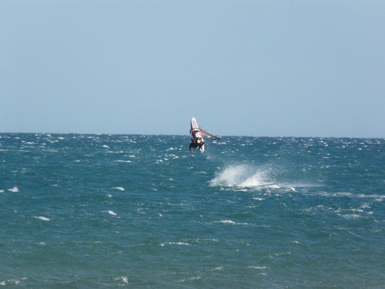 Fin d’après-midi bien meilleure que le début de journée ne le laissait présager. Après de bonnes averses pétolesques, les éclaircies leucatoises ont fini par prendre le dessus vers 15h30 et le vent est rentré progressivement pour permettre de sortir les 9 voire 7m2 en kite et les 5,0 m2 en planche. Pierre et Dom’, parmi les premiers à l’eau, ont d’ailleurs pu sentir le vent prendre des tours progressivement. A signaler que l’eau n’est pas encore très froide pour la saison, ce qui rend les gamelles encore largement supportables…Testé et approuvé !