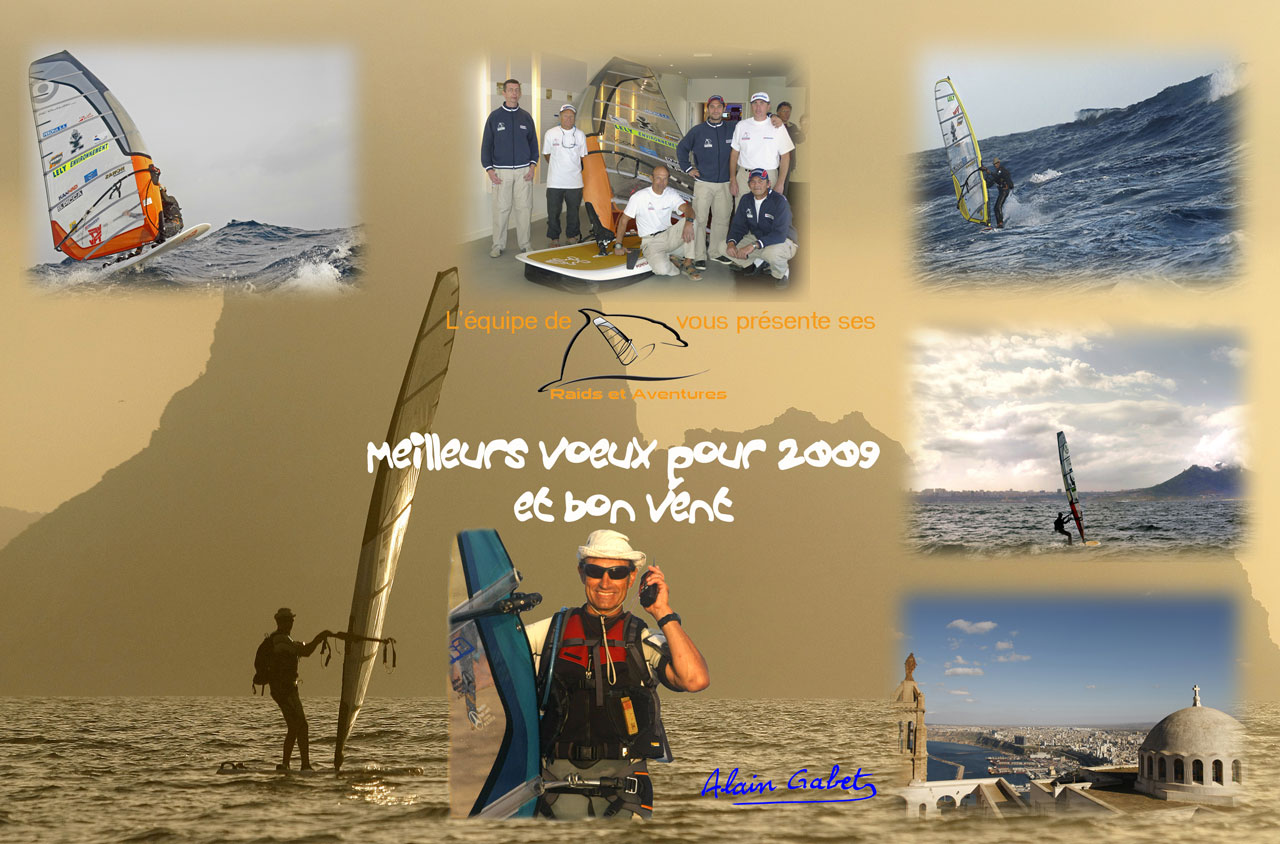 Le windsurfer audois nous envoie ce jour une carte de voeux 2009 bien sympathique teintée d’une note d’aventure qui laisse penser que le sieur Gabet n’en a pas fini avec ses projets. A suivre….