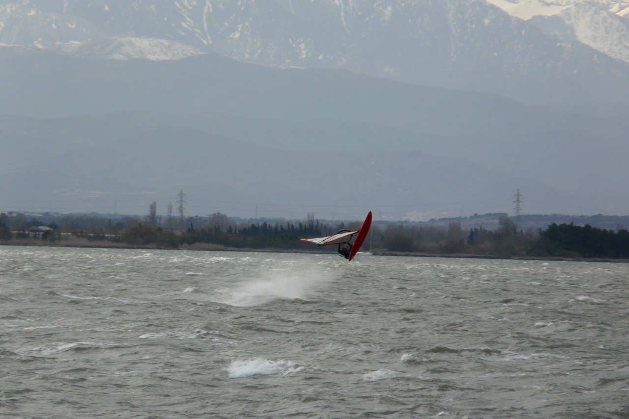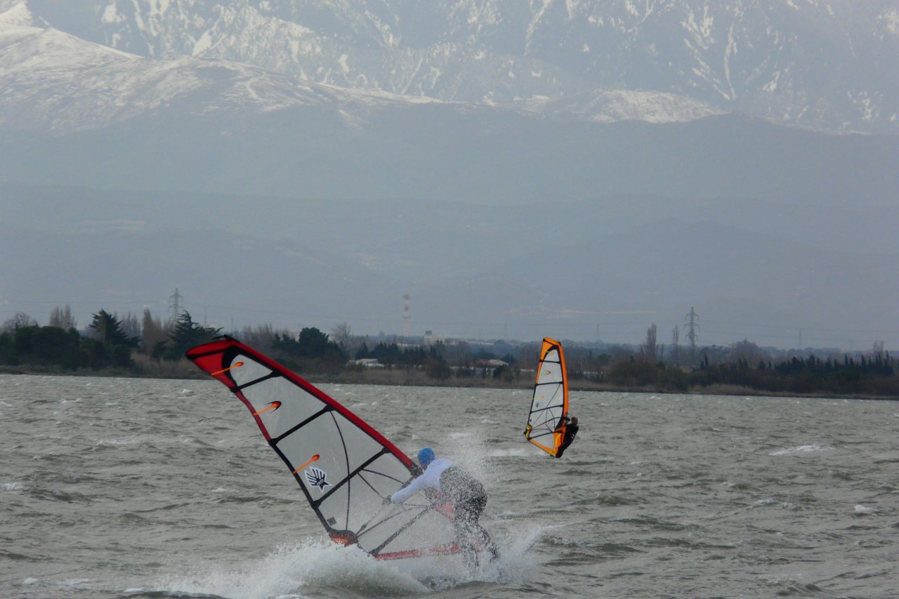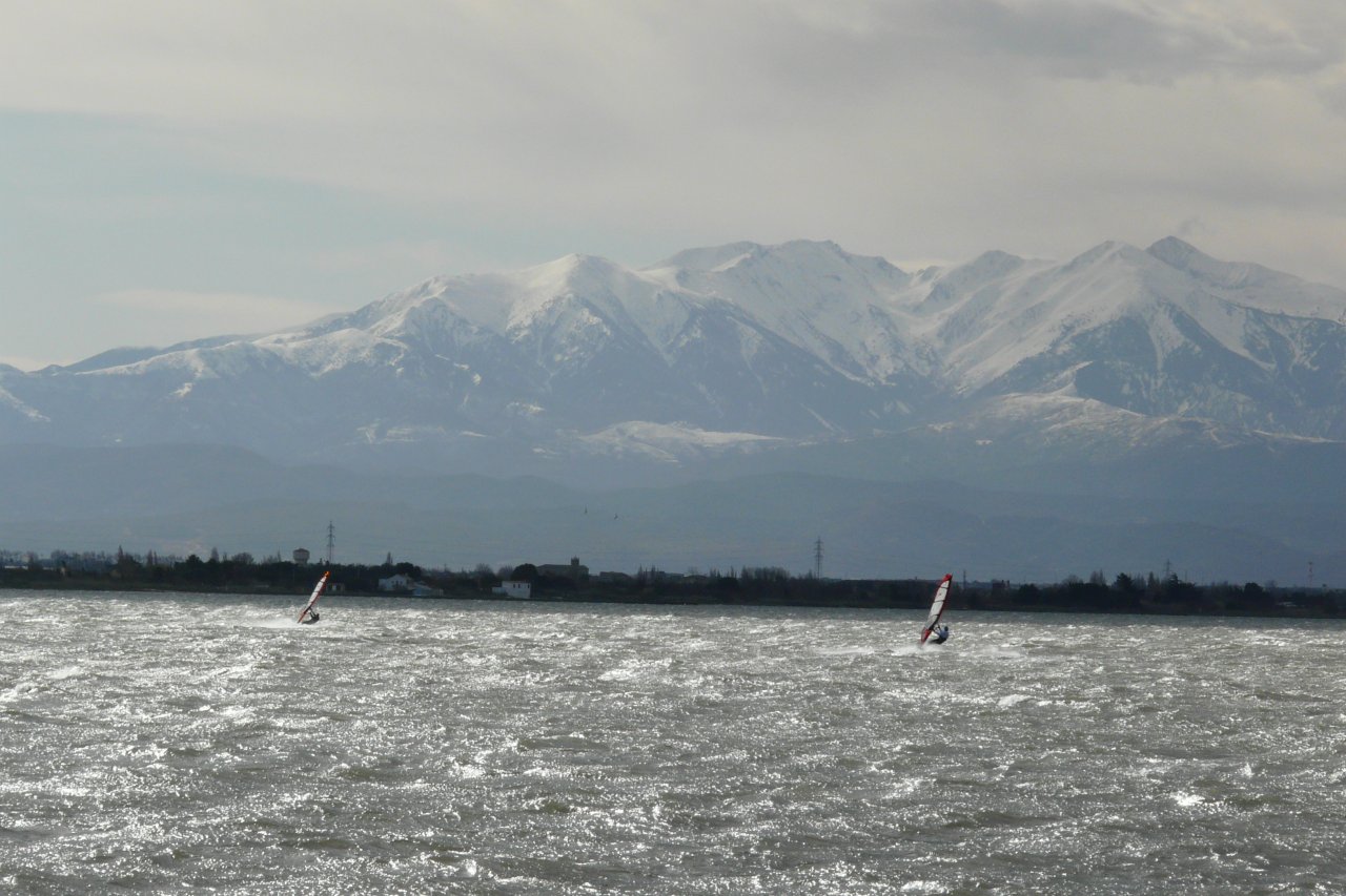 De la tramontane forte et de la « fraîcheur », ce samedi, pour les irréductibles de l’étang qui sont allés se faire une belle session de tramontane à la Coudalère (Barcarès). David, une fois de plus sur le coup, a rejoint Annie, DD et les habitués du spot pour naviguer en 4/4,5 m2 dans un vent irrégulier qui prendra des tours en fin de journée. Cela n’a d’ailleurs pas réellement faibli durant le week-end puisque la tramontane, qui soufflait à près de 80 km/h à Leucate samedi, a poussé une pointe à 100 km/h aujourd’hui tandis qu’au cap Béar, on relevait 137 km/h hier et 144 km/h cette après-midi…