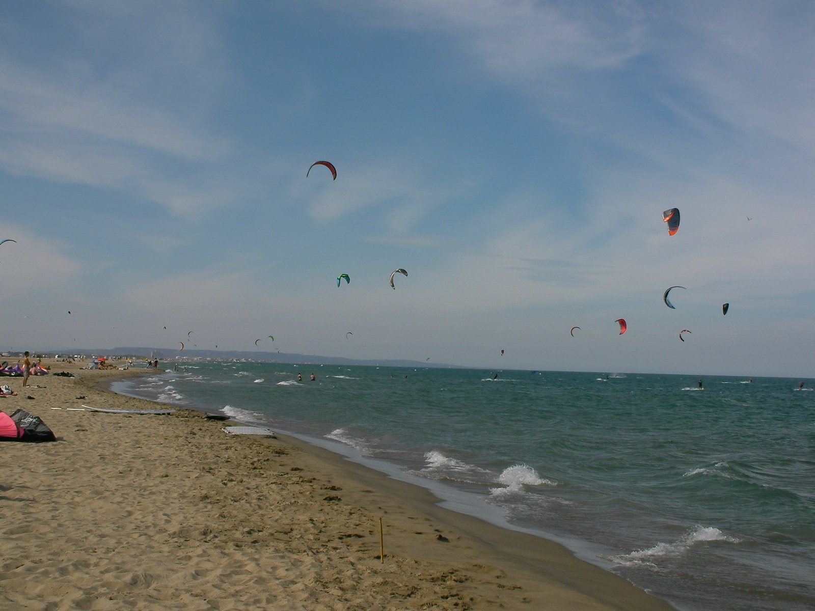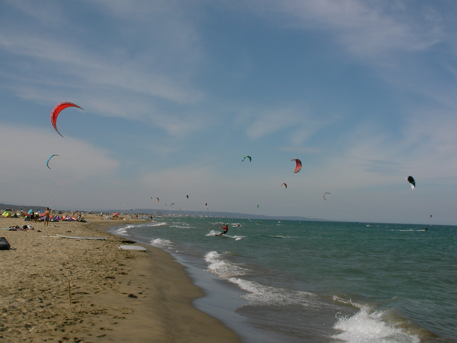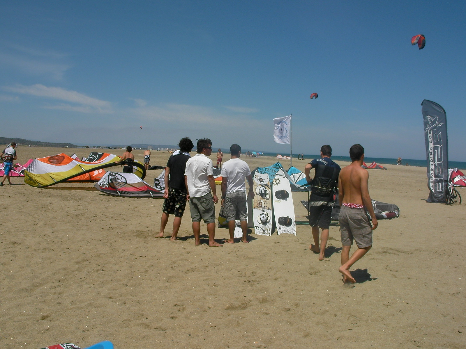 Samedi 11 juillet était le jour des premiers kite tests mis en place par le KiteSurf Leucate auxquels participait Chinook surfshop. Dès 14 h, le thermique prévu est venu soutenir Olivier, Antoine et Philou dans une longue session d’essais qui a duré jusqu’en début de soirée. 15 à 20 nds de Sud/Sud-Est se sont donc établis et renforcés, surtout au large du cap Leucate. Des conditions parfaites pour tester entre 9 et 12 m2 pour les kites mais aussi essayer une dizaine de boards dispos ce jour là.