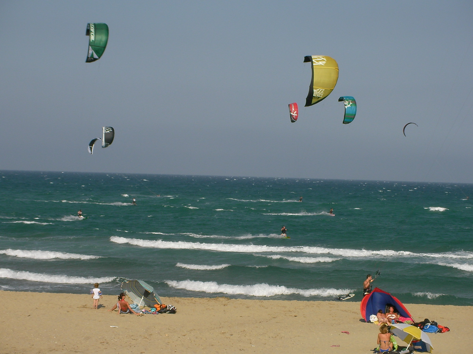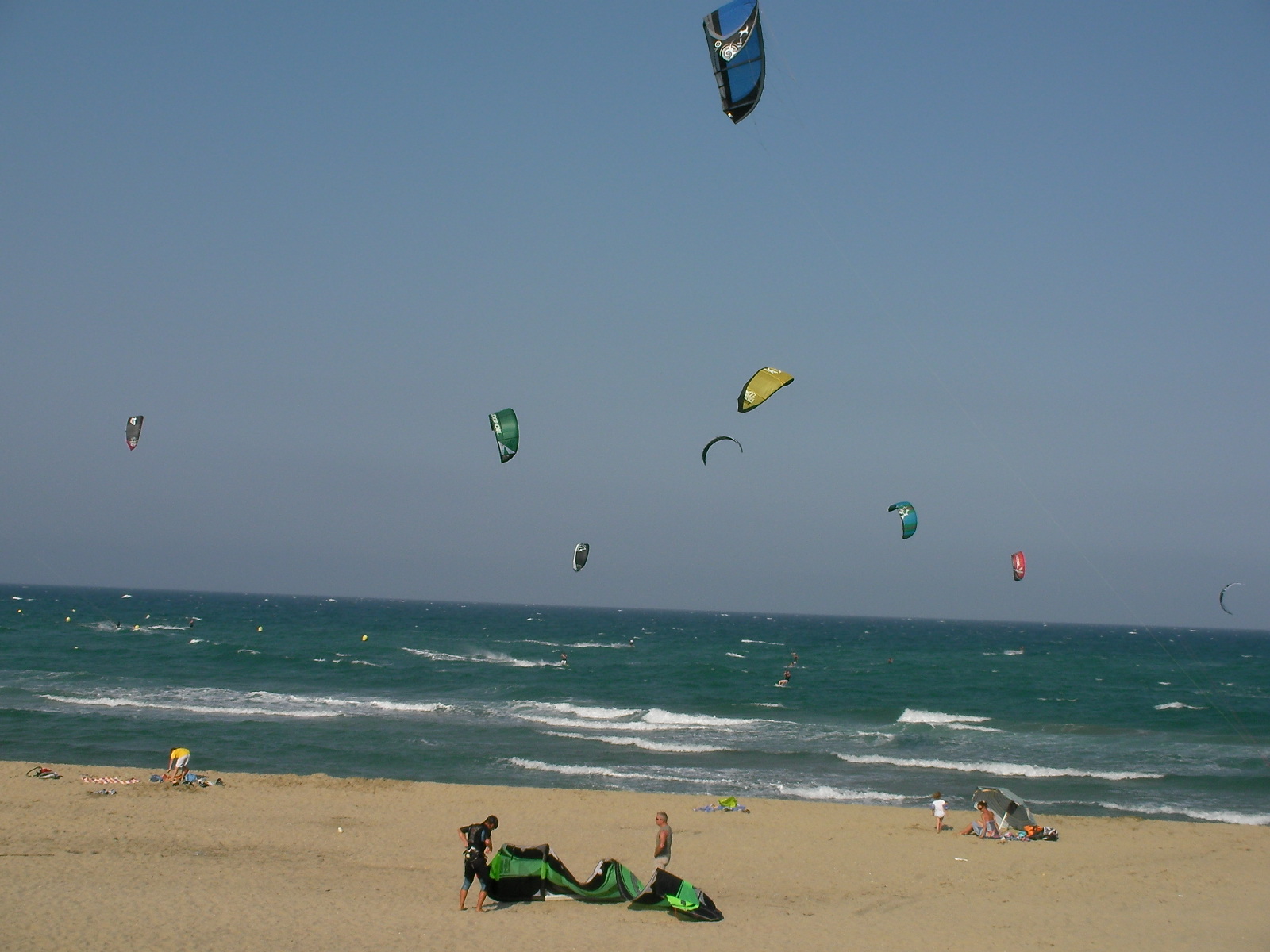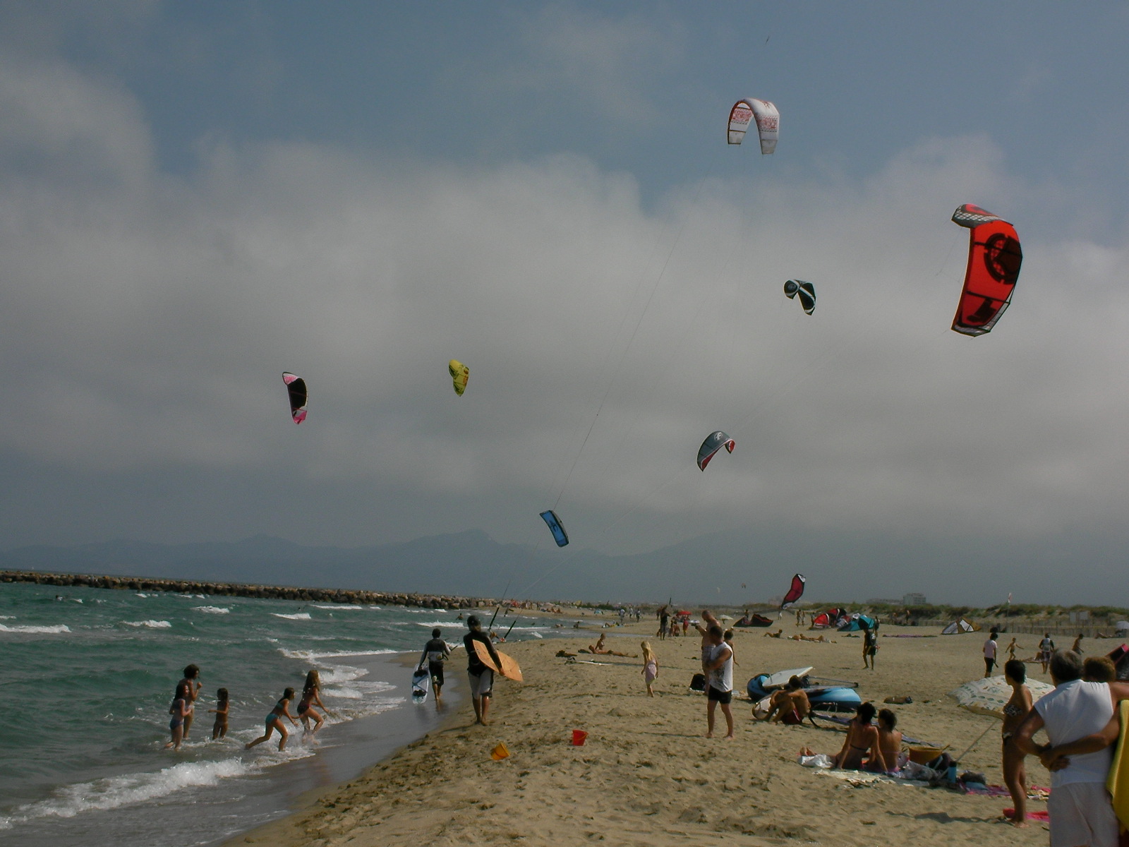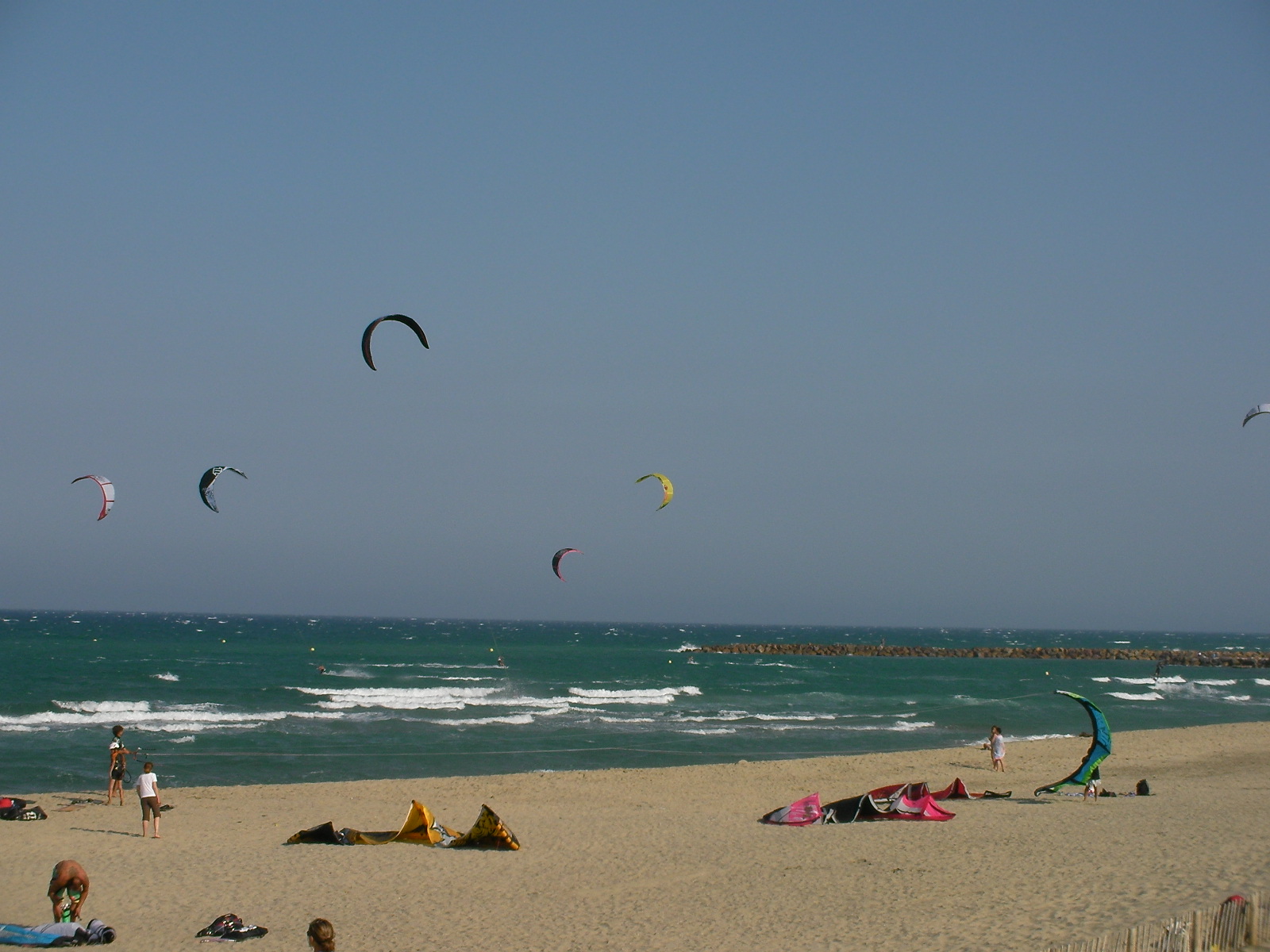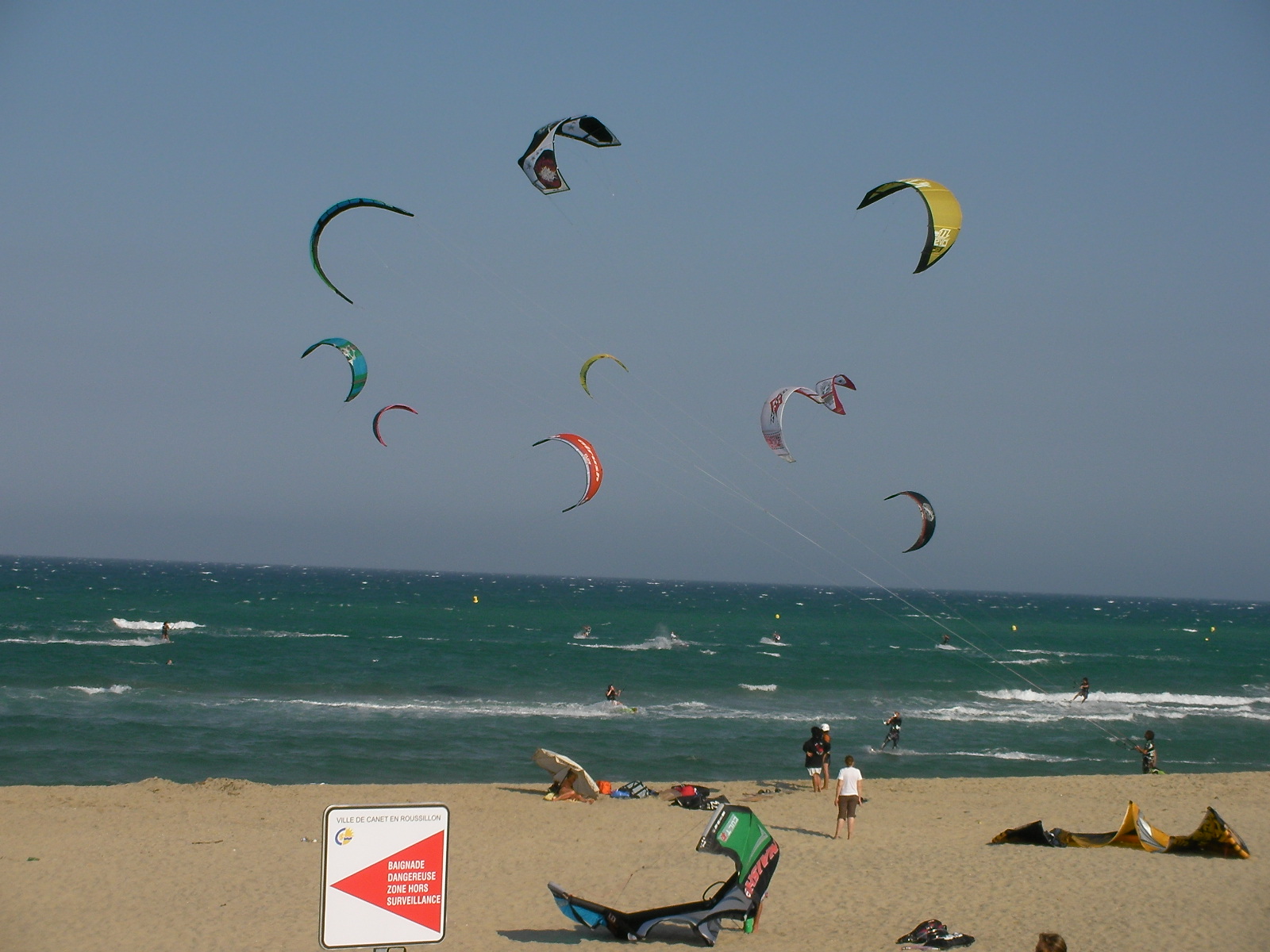 En début d’après-midi, tout le monde est plein d’espoir sur le spot de Canet Sud car ce jeudi doit, d’après les prévisions météo, être propice à une session de marin. Pourtant, les heures passent et les 12 voire 14 m2, même avec de grosses boards, ne suffisent pas à remonter le moral de ceux qui voulaient y croire. Alors on observe la mer, les nuages qui défilent, on discute voire on commence à plier doucement avec le regret de ne pas avoir eu quelques noeuds de plus…