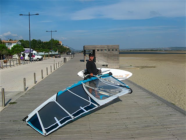 La board: dernière née de l’atelier SUN7 custom-board shapée par Pierre Bracar, reçue en direct de Fuerteventura. 238 par 56 pour 80 litres version trifins, central 19cm et latéraux 13cm, construction full PVC/verre/UD carbon ..le tout pour 6kg!!!!! Et bien renforcée !!! Le Totof aime bien jumper!!! J’ai déjà essayé par tram et je suis très content du résultat!!! Il me tarde d’essayer dans le marin!!! Le retour du surfer d’argent!!! Ahahaha