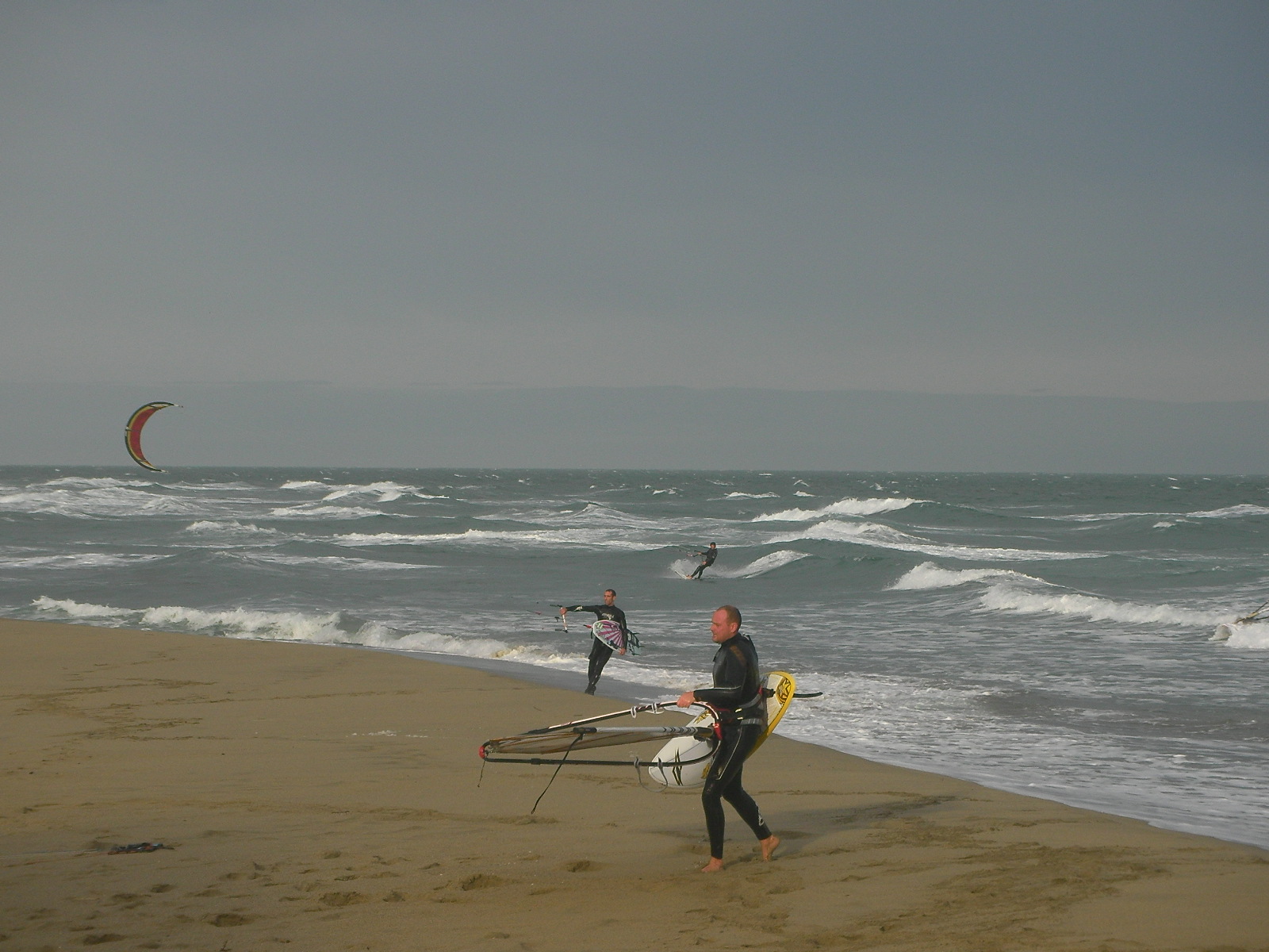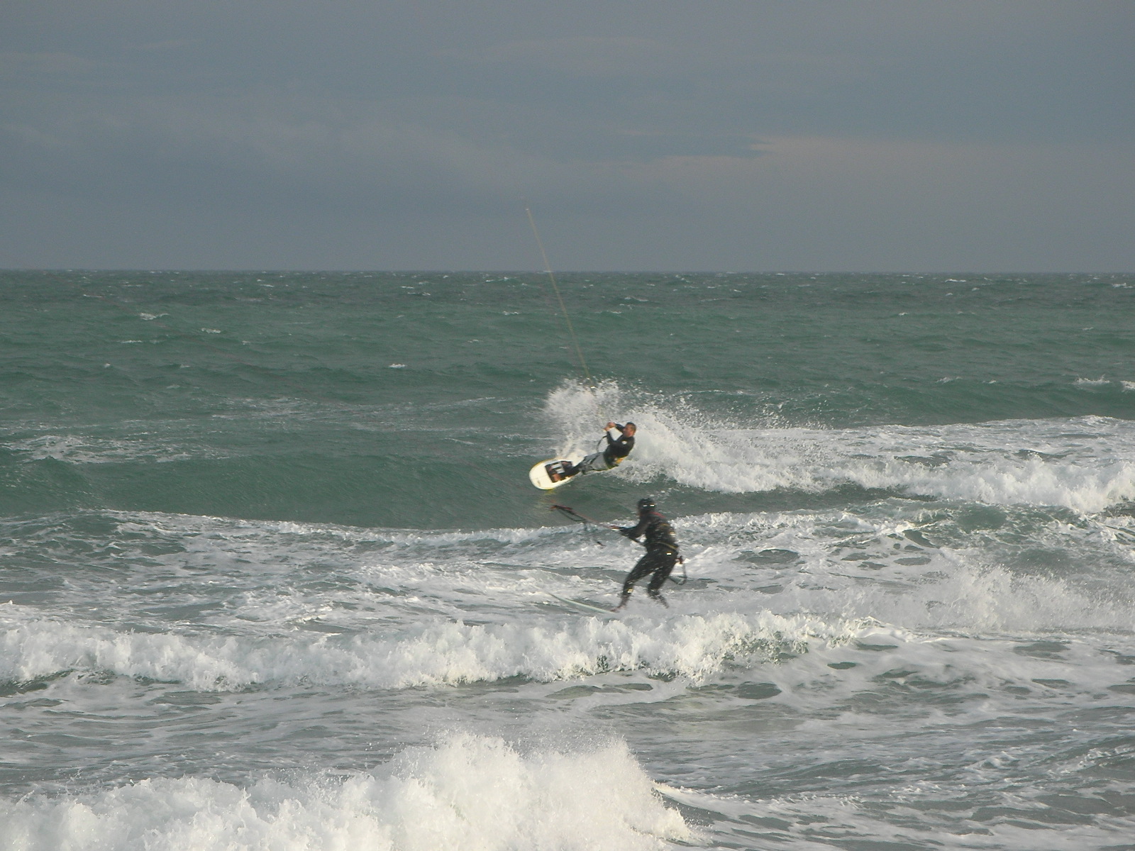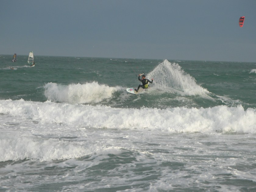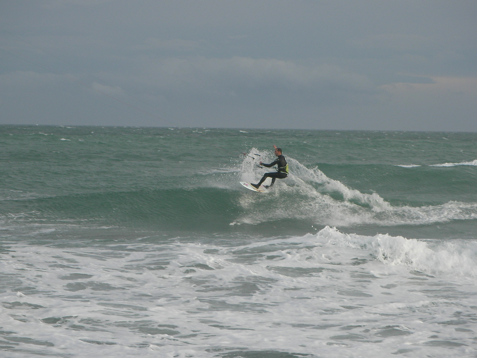 Jusqu’à 14 h, que dalle, nada, walou…Puis, d’un coup, 30/35 nds de Sud-Est, resté bloqué je ne sais où, ont déboulé pleine balle ce jeudi sur les spots de Leucate. Après un premier flux bien fort, le vent va chuter rapidement mais ceux qui commençaient à plier les lignes et décrocher le wish se sont rapidement ravisés puisque le vent a repris son élan pour s’orienter Sud / Sud-Ouest. Deuxième très bonne session donc, avec cette fois des vagues plus grosses et rangées qui ont permis de surfer frontside pile poil à quelques heures du réveillon et ce quasiment jusqu’au coucher du soleil.