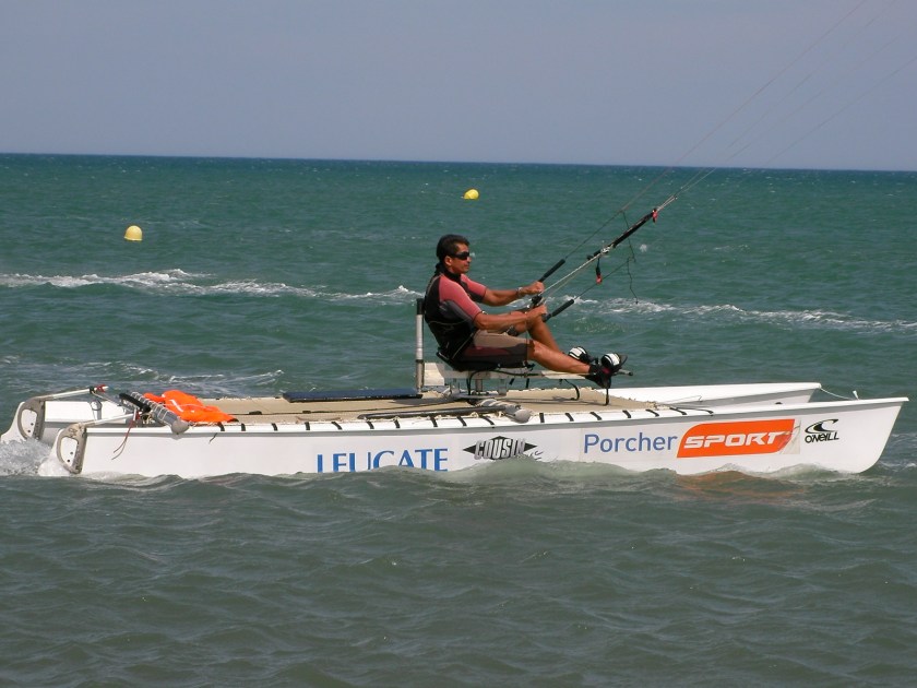 En cette saison, certains skient, voyagent, d’autres hibernent mais Armand Torre, lui, en profite pour se creuser la tête. Entre deux sessions, ce passionné qui compte parmi les pionniers du kitesurf de la région, continue de mettre au point son dernier projet en date : le catakite. Après avoir shapé ses planches de windsurf, il a pris le virage du cerf volant et est même devenu concepteur d’ailes par passion, ailes qu’il continue de dessiner pour son plaisir personnel. Depuis quelques temps, il a trouvé une nouvelle source de cogitation dans son projet bateau avec l’idée d’obtenir la plus grand autonomie possible tout au long des sessions. En 2008 et plus encore cette année, son catamaran a fait sensation du côté de la Franqui par tramontane et à Argelès dans les gros thermiques du printemps. Restait pour Armand à améliorer la neutralisation de l’aile en vol afin de rendre la préparation plus simple, même seul. Il semblerait que le but soit en passe d’être atteint avec la mise au point d’une ligne spécifique rendant le kite autostable et débrayable à volonté avant, après et entre deux phases de navigation. Mieux qu’un long discours technique, la vidéo toute fraîche qu’Armand nous envoie laisse augurer de belles perspectives pour les sessions à venir.