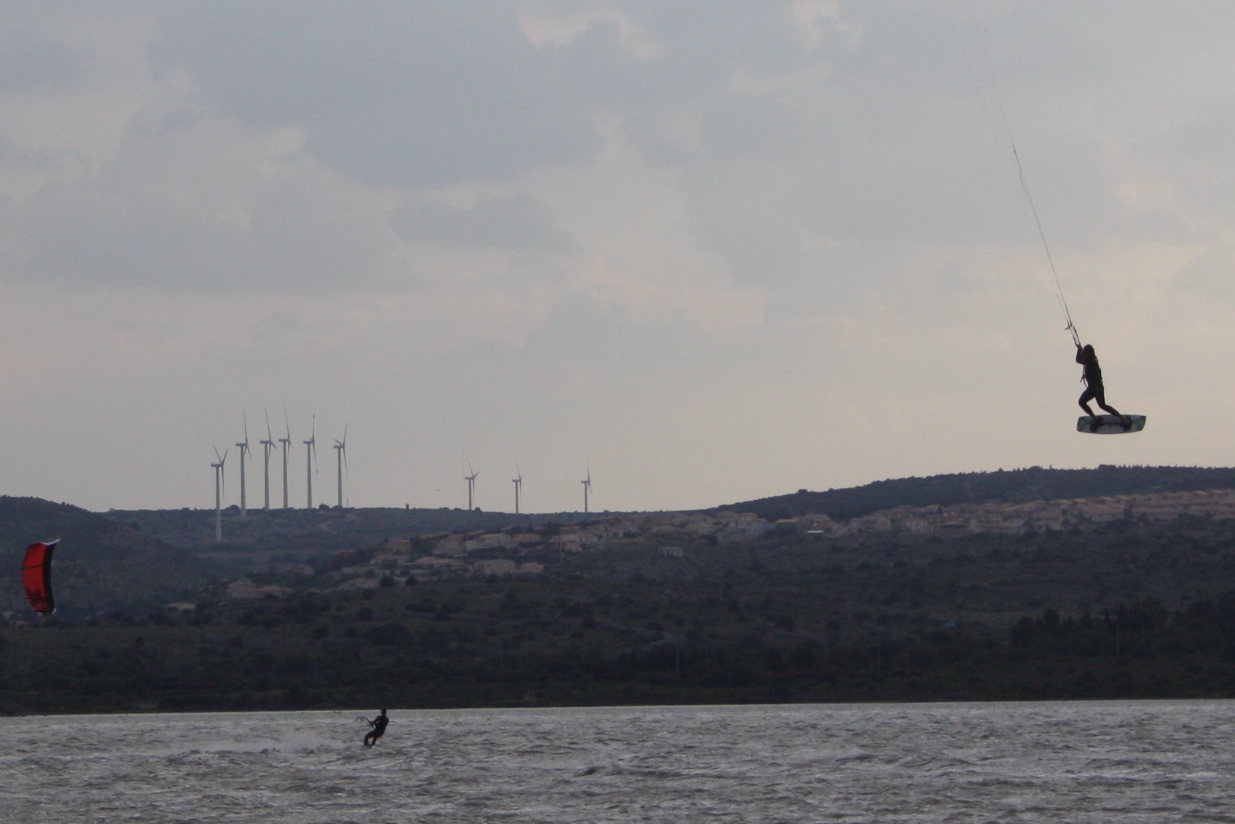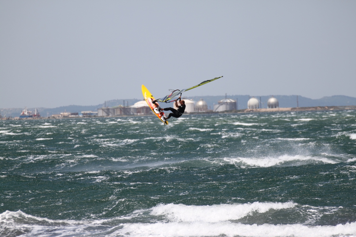 Encore une petite session hier. Temps gris et pluie annoncés sur Hyères, nous décidons d’aller rejoindre une région plus ventée, à l’ouest de Marseille. Le vent étant trop offshore à Carro, nous nous rendons à Marignane, son étang de Berre, ses usines et son aéroport.