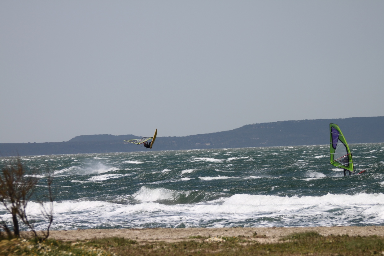 Le spot est quasiment désert, 40-45 noeuds à l’anémo sur la plage, du gros clapot, voire des vagues . Cela ressemble à Coudalère mais en plus extrême avec l’arrière plan de Port la nouvelle. Hop ! En avant, Ezzy 4.0 m² et Goya 72 Ltd pour 3 heures de nav. En attendant la prochaine…