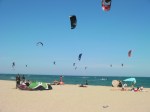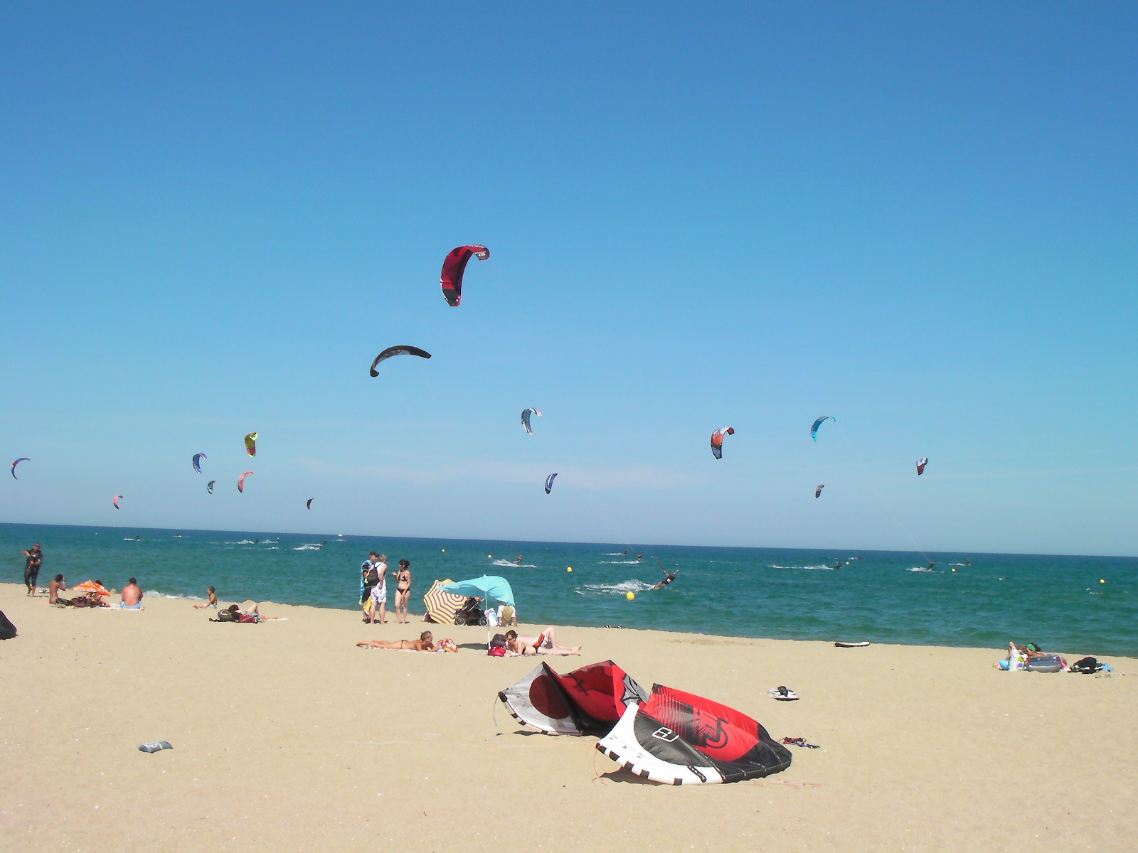Non, nous ne sommes pas à Canet, un jour d’affluence normal, comme il en existe de très nombreux tout au long de la saison, mais sur la plage des coussoules ce mardi après-midi. Alors que la tramontane s’est complètement éteinte dès le début de matinée, le vent thermique de Sud-Est s’est installé progressivement pour monter à un bon 15/18 nds. Ces conditions ont attiré plus près de 25 kites sur le spot, ce qui est plutôt rare puisque le thermique des coussoules est généralement partagé par une dizaine de chanceux grand maximum. Cruising, déhookage, remontées jusqu’à la falaise de la Franqui au milieu des bateaux au mouillage, entre 9 et 13 m², tout ce petit monde s’est régalé dans ce vent régulier et doux qui a baissé puis repris quasiment jusqu’à 19 h. Etonnant.