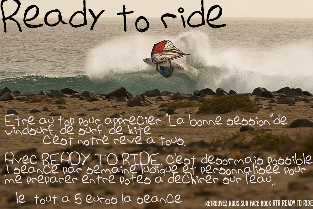 C’est le concept READY TO RIDE: Pas de pré requis de niveau sur l’eau ni de condition physique, tout le monde est bienvenu. Pour 5 euros par semaine et par personne (5 personnes par séance minimum), venez nous rejoindre à Saint Cyprien chaque semaine pour une séance ludique, variée et personnalisée entre potes, sur la plage pour prévenir la blessure, se connaître, se préparer et découvrir les moyens simples pour être bien sur l’eau. Si vous souhaitez participer avec vos potes mais Saint Cyprien est loin car vous êtes sur Leucate, si vous souhaitez que j’intervienne dans votre club et organise une séance près de chez vous, je peux mettre en place des sessions RTR sur votre spot. Vous êtes à l’autre bout de la France, de l’Europe mais vous vous posez des questions car vous voulez être au top pour profiter de vos vacances, de votre trip ou vous voulez participer à des séances RTR durant votre séjour, la Page Ready To Ride Facebook est la solution pour vous tenir au courant des sessions et poser vos questions.