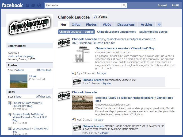 Depuis quelques jours, Chinook Leucate vous propose, en complément du blog, de suivre l’actu du magasin sur sa page Facebook. Vous pourrez ainsi recevoir, avec plus de réactivité et directement sur votre page perso, les événements, sessions, journées tests, rencards, infos, photos et tout ce qui pourrait vous intéresser dans les news. L’accès direct pour vous abonner est donc désormais possible depuis le menu du blog et sous chaque article lors des mises à jour.