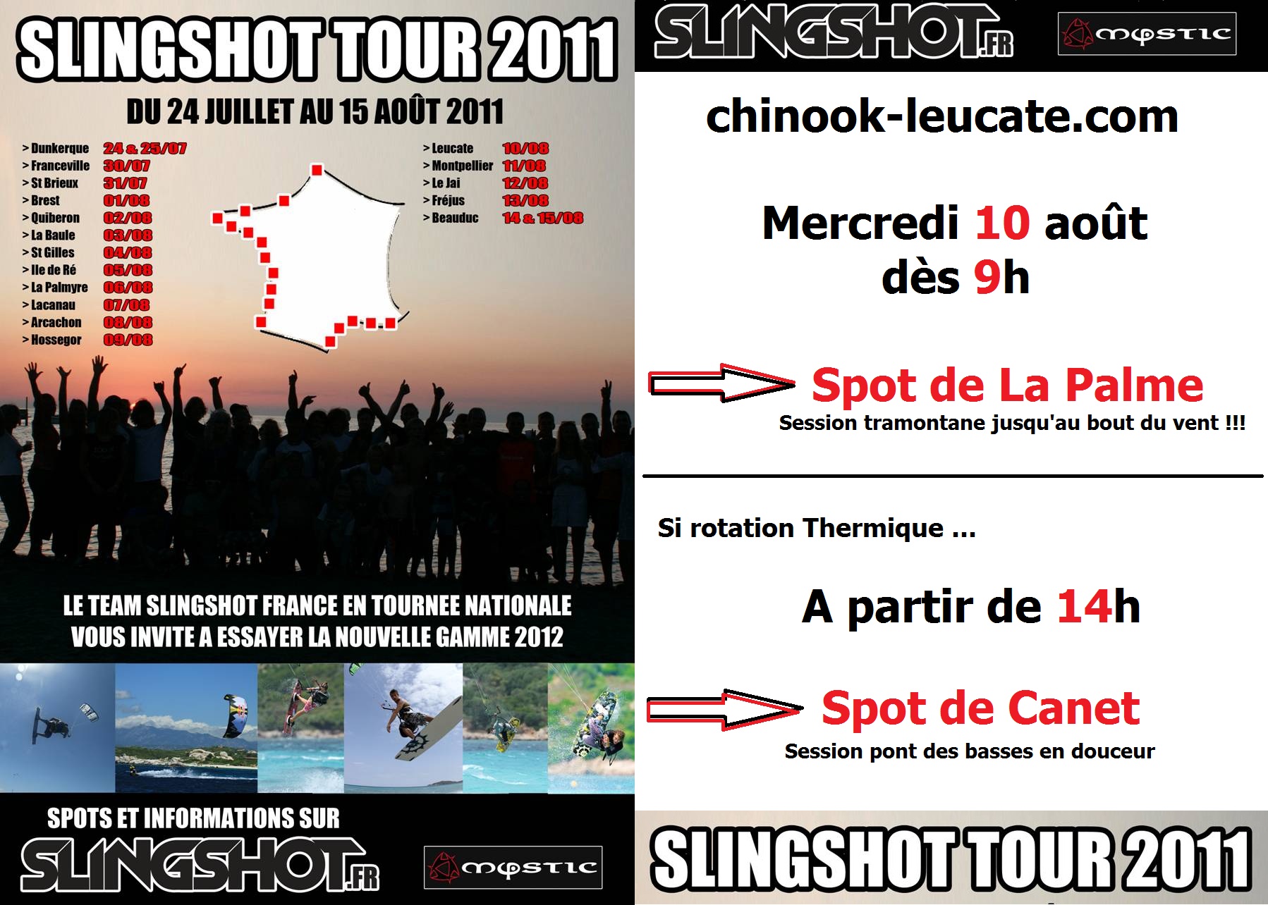 C’est reparti pour la tournée d’été Slingshot qui parcoure les spots de France depuis fin juillet et s’arrêtera finalement sur le spot de La Palme dès 9 h en raison des prévisions de tramontane modérée. Si le vent venait à tourner en flux de thermique, la caravane Slingshot pourrait lever le camp et se poser à partir de 14 h pour une seconde session test sur le spot du pont des basses à Canet Plage. Toutes les infos, toutes vos questions par téléphone au shop 04 68 40 17 17.