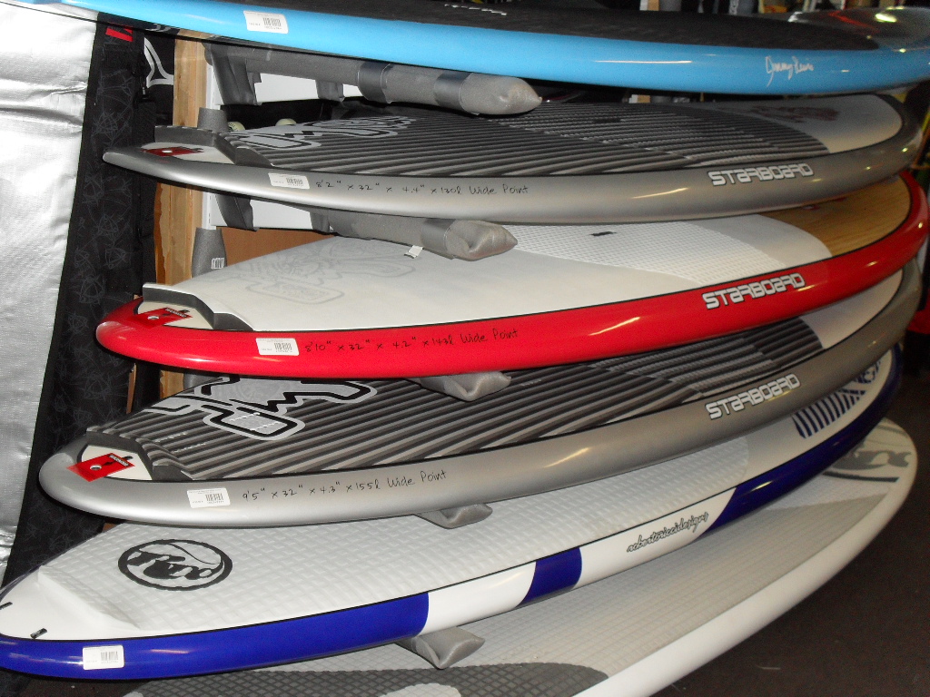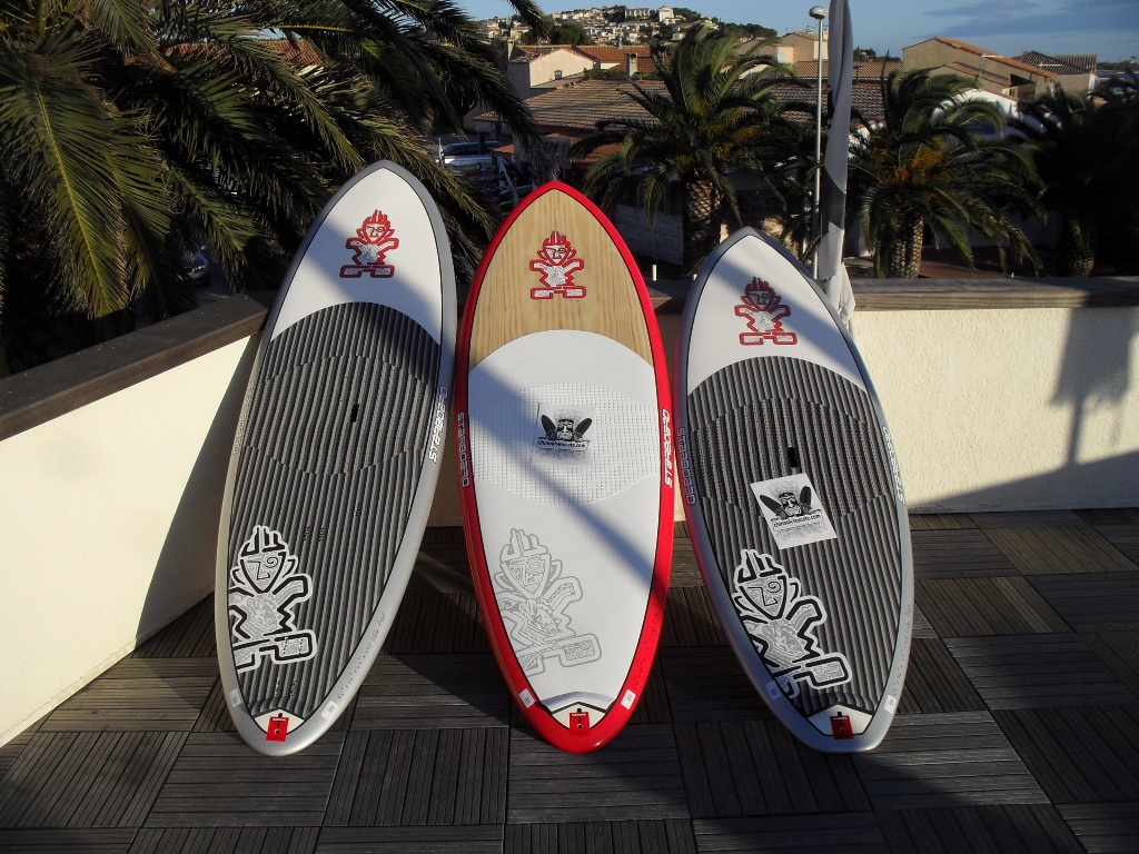 Olivier nous envoie les toutes dernières infos du shop concernant l’arrivée des nouveautés Starboard SUP 2012. L’arrivage de la semaine concernait la famille « Wide point » qui prend de l’ampleur cette année. 9’5″, 8’2″ et 8’10 sont disponibles au rayon SUP avec un coup de coeur pour Olivier sur la finition de ces nouveaux paddles dont le petit 8’2″ (à droite) au shape étonnant qui donne envie de tester. Le 8’10 » en version wood, quant à lui, en met plein la vue au tarif placé de 1250 euros. Avouez que cette teinte rouge et ce bois, ça ferait son effet au pied du sapin. A réfléchir.