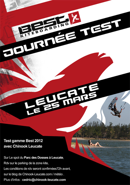 Cédric est de retour au shop et attaque la saison par une journée Test de la gamme Best kiteboarding 2012. Cela se passe dimanche 25 mars à partir de 14 h et ça se déroulera à priori sur la zone kite du parc des Dosses à Barcarès (à côté du téléski nautique). Vous pourrez tester les nouvelles boards 2012 (Armada et surf), les kites 2012 (TS, Kahoona, Némésis et GP) équipés de la nouvelle barre.