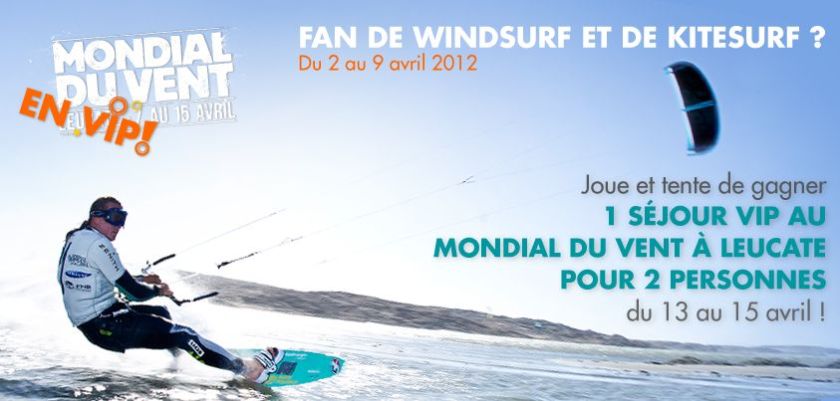Du 2 au 9 avril, l’organisation du Mondial du Vent vous propose de jouer et peut-être gagner un séjour V.I.P. du 13 au 15 avril. Pour cela, rien de plus simple: il vous suffit de cliquer « j’aime » sur l’application facebook Mondial V.I.P. et vous serez peut-être l’heureux gagnant avec la personne de votre choix pour partager un moment agréable au cœur du festival leucatois. Alors ? i clique ?