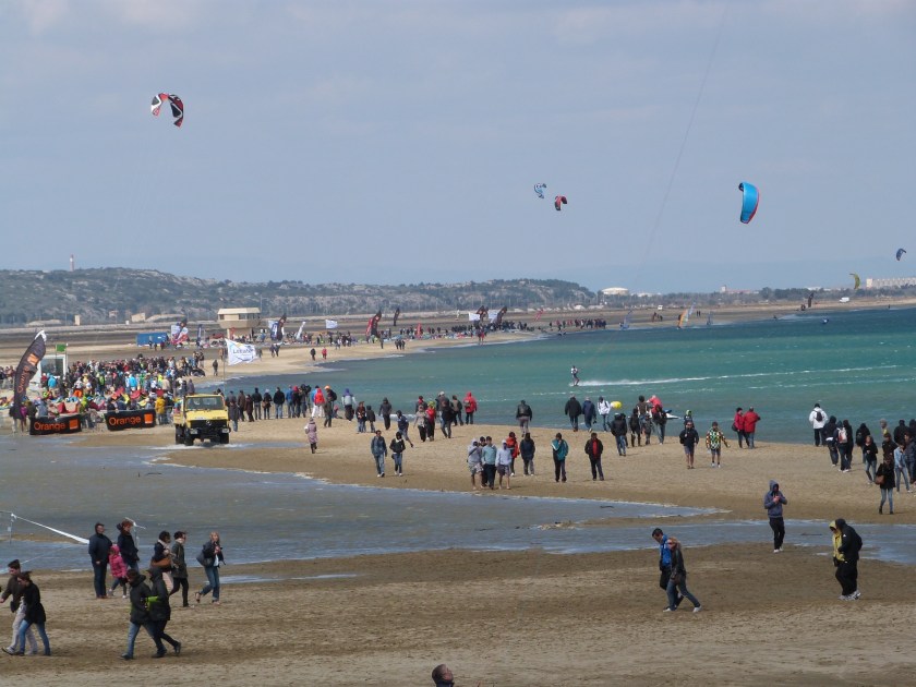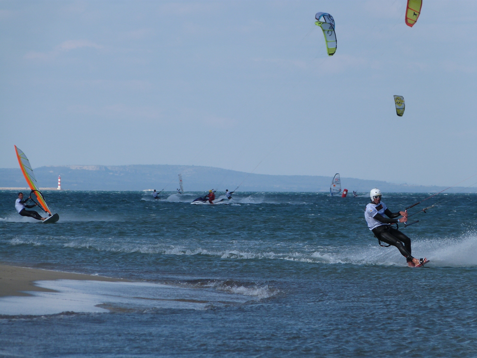 Un dimanche riche en de nombreux points pour la deuxième journée du Mondial du Vent. Après la tramontane d’hier source de prise de tête pour les riders et l’organisation, c’est un courant de Nord-Ouest enfin franc et viril qui a déboulé sur le festival ce dimanche. Nuages, quelques gouttes, 30/40 nds bien rafaleux sur un plan d’eau haché, dur métier que celui de freestyler kite dans de telles conditions. Pas plus évident pour l’Orange speed crossing où les runs furent serrés pour le gratin des wind and kite speeders. L’après-midi fut plus ensoleillée et donc motivante pour les spectateurs nombreux à investir la plage et les allées du village de la glisse. Belle journée.