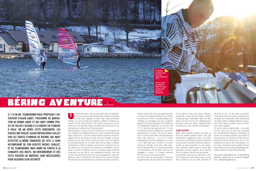 Une nouvelle info d’Alain Gabet qui se prépare à un nouveau défi à savoir la traversée du détroit de Béring avec son coéquipier Michel Ouallet. Soutenu par Planchemag, ce projet prévu pour juillet 2012 est en cours de finalisation y compris au niveau financier puisqu’il manque encore 7500 euros pour boucler le budget. Depuis le 6 avril, Alain propose via le site Kiss Kiss Bank Bank de soutenir son aventure en faisant un don à hauteur des envie de chacun et à partir de 1 €. si vous le souhaitez, n’hésitez pas à faire un geste et à suivre les préparatifs sur le site beringaventure.fr.