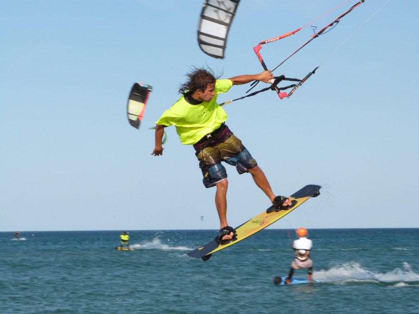 Un petit portfolio sera parfait pour résumer la session de ce dimanche avec un coup de zoom sur deux des acrobates du jour, motivés pour fêter dignement le retour de la tramontane: Erwan, habitué du spot de la Franqui mais aussi Alvaro Onieva que ceux qui suivent les compétitions PKRA connaissent bien. Le rider espagnol est en effet venu passer la journée de notre côté des Pyrénées avec ses collègues et en a profité pour se prêter au jeu de la freestyle session en envoyant quelques beaux tricks. Rien de tel pour booster les kitesurfers locaux !