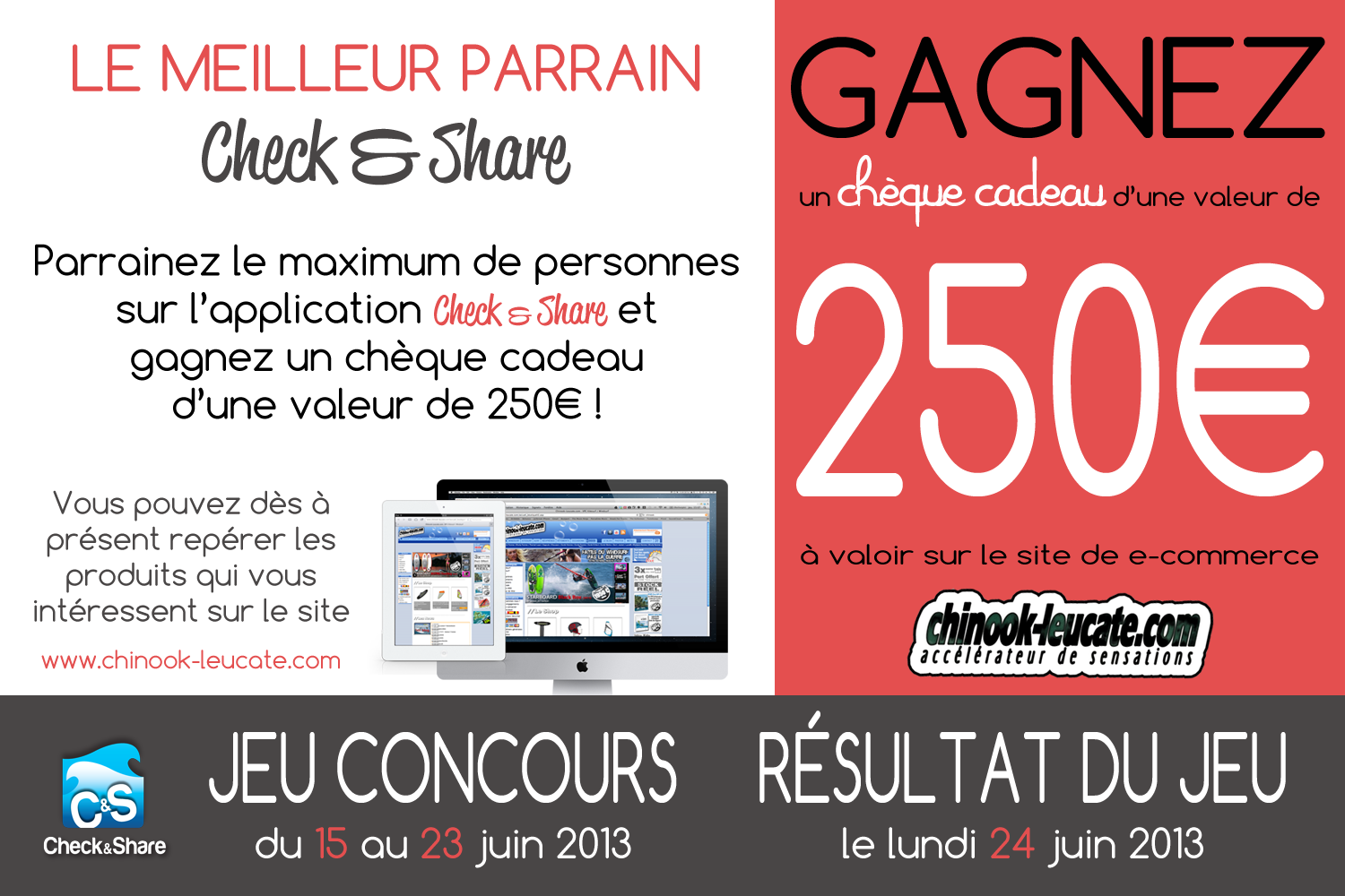 Check & Share, vous connaissez ? Alors il est temps de découvrir cet exceeeellent site d’infos vent et vagues relevées par les membres et mutualisées pour tous les spots des riders de la communauté. D’ailleurs figurez-vous que Chinook Leucate s’associe avec Check & Share pour vous proposer un jeu concours dont le gain est un joli chèque cadeau de 250 euros d’argent tout neuf à valoir dans votre surf shop adoré. Pour gagner, c’est simple, il suffit de parrainer un maximum de personnes sur l’application C & S sans oublier de dire à vos filleuls de renseigner le champ « nom du parrain » avec votre pseudo. Attention, ça ne dure que du 15 au 23 juin alors feu à volonté !