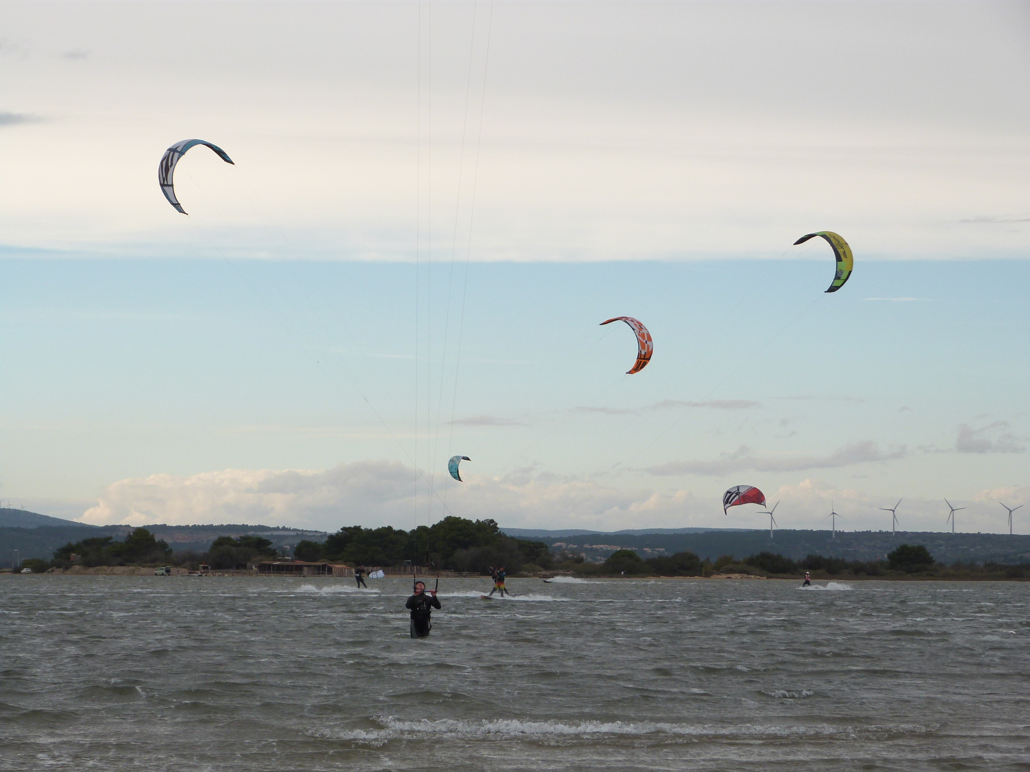Après les conditions franchement douces de la semaine passée, le contraste avec cette journée de mardi était…sensible. Ciel bouché, vent irrégulier, température en nette baisse, il ne restait que l’eau pour garder un peu de la tiédeur ramenée par le marin qui semble déjà bien loin. La tram’ quant à elle, ne s’est visiblement installée que sur l’Aude puisque de nombreux riders de P.O. se sont retrouvés à Leucate faute de conditions suffisantes dans le Sud. Du coup, près de soixante kiters et une bonne vingtaine de planchistes ont partagé la session, donnant une impression d’affluence comme au plus fort de la saison. Surprenant.