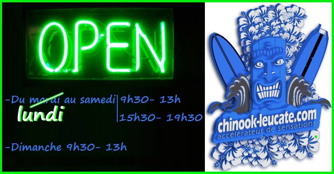 Chinook Leucate est désormais ouvert 6 jours et demi sur 7 à compter d’aujourd’hui puisque le shop ouvre désormais ses portes également le lundi aux horaires habituels: 9h30-13h / 15h30-19h. Une journée de plus pour trouver le matos et les conseils qu’il vous faut !