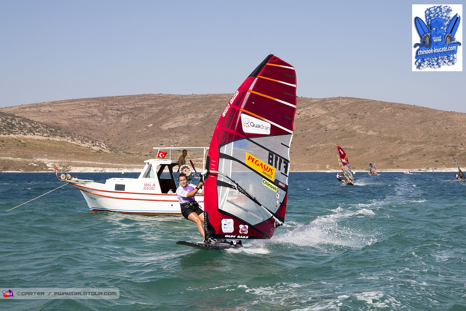 La seconde étape de la Coupe du Monde de Slalom de la saison s’est déroulée à Alaçati en Turquie du 17 au 22 août. Ce spot de Turquie est reconnu pour recevoir tout au long de l’été des conditions de vent (le Meltem) plutôt soutenues. Lors de cette semaine de compétition nous avons pu effectuer 4 manches dans des conditions finalement légères entre 10 et 15 nœuds. Je termine respectivement seconde, troisième et seconde sur les 3 premières manches et 6ème sur la 4ème manche. J’ai été très à l’aise dans ces conditions et ce plan d’eau très plat sur lequel un excellent départ est indispensable. J’ai su être offensive dès le début et ma constance sur les différentes manches m’a permis de rester tout au long de la semaine sur le podium. Au terme de cette semaine, je termine donc à la seconde place et signe par la même occasion mon premier podium sur la Coupe du Monde PWA en Slalom!!!