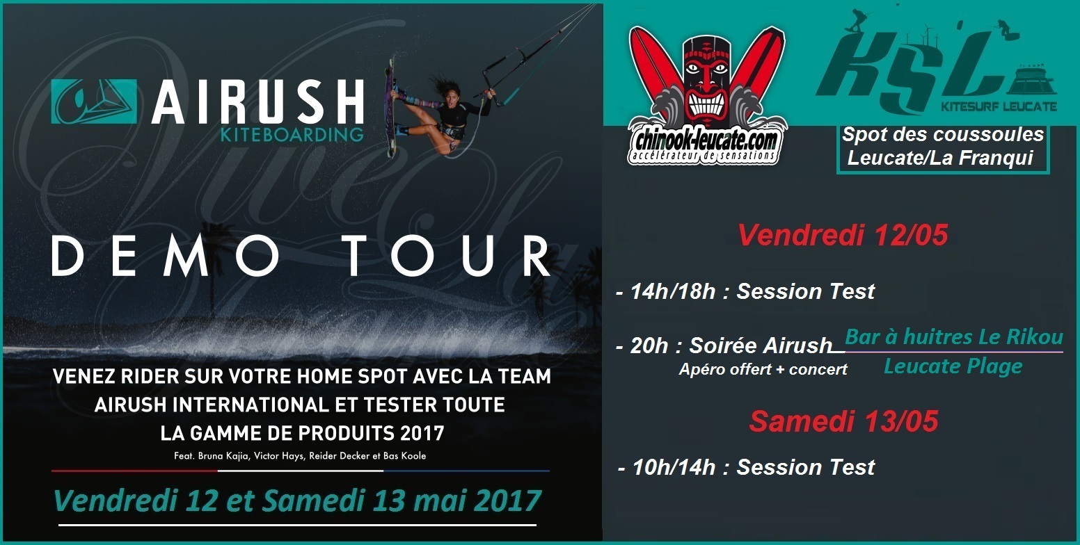 Vendredi 12 et samedi 13 mai, Chinook Leucate accueille le team Airush pour 2 jours de test entrecoupés d’une soirée de vendredi au bar à huitres Le Rikou à Leucate plage. Au programme, des essais bien sûr mais aussi pas mal d’infos techniques à disposition sur les produits kites, surfs, twintips et foils de la marque basée en Afrique du Sud. Les riders du team seront présents notamment Bruna Kajiya, Victor Hays, Reider Decker et Bas Koole et ils ne devraient manquer l’occasion de se mettre à l’eau avec vous sur le spot KSL de La Franqui/Les coussoules. Rendez-vous donc sur la plage à partir de 14h vendredi et dès 10h samedi matin.