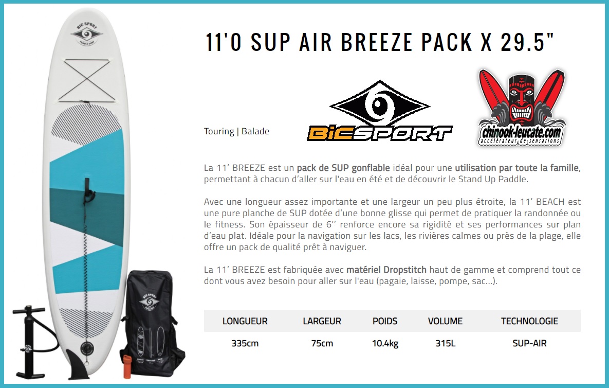 Petit tour cette fois au rayon SUP avec la nouveauté du jour au shop. On ne présente plus Bic Sport mais on vous déballe le dernier SUP gonflable à prix très serré de la marque. Le pack Air Breeze, c’est 11′ par 29″, 315 litres, c’est livré complètement équipé avec sangle de maintien sur le pont, aileron, pompe, sac de transport, leash + une pagaie vario (oui Monsieur!) et ça nous fait une opportunité en or… à seulement 399 euros. Désormais en stock et à découvrir sur www.chinook-leucate.com. 🙂