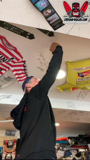 Les VIP du jour, ce sont les Dunkerbeck père et fils de passage au shop dans le cadre de la participation du fiston Liam à l’épreuve Wingfoil du Mondial du vent. Belle occasion pour l’équipe de partager un moment avec Bjorn qui marque en 2022 son retour au sein du team Starboard / Severne, histoire de tirer la bourre avec son grand sous les mêmes couleurs en windsurf tandis que Liam complète sa panoplie de waterman avec les Airush Freewing sur les épreuves espagnoles et mondiales. La signature du plafond du magasin? Evidemment, quelle question! 🙂