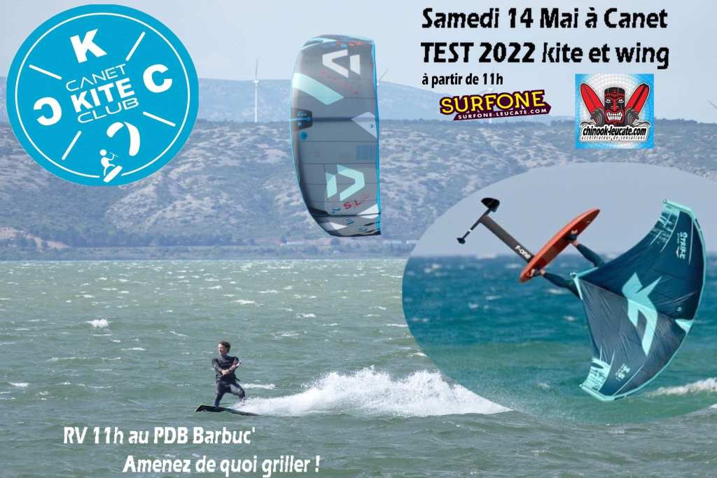 La bonne nouvelle du jour, c’est que l’équipe du Canet Kite Club organise un samedi tests Kite & Wing ce samedi 14 mai! Chinook Leucate répond présent à l’appel de l’association des P.O. pour amener dans sa hotte plein de matos à vous faire découvrir sur le spot du pont des basses. Comme le dit l’affiche, ça se passe à partir de 11h, y’a le barbeuk pour vous faire griller la saucisse et très certainement du bon thermique en vue pour que ça glisse. Allez viendez, ça va rider! 🙂