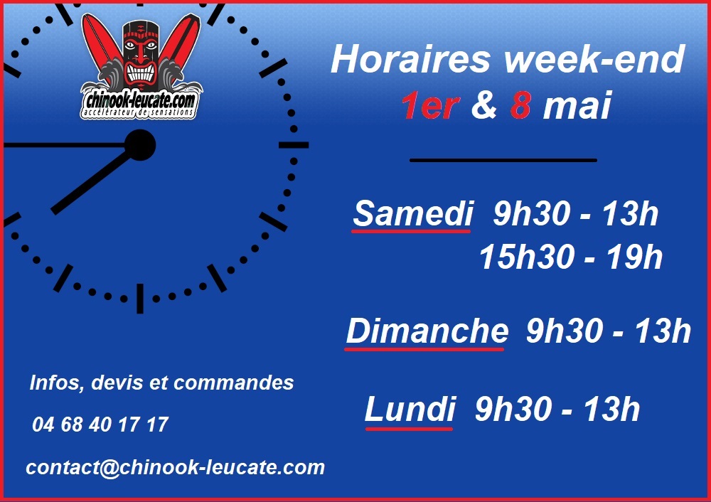 L’info du jour, ce sont les horaires du shop qui s’adaptent aux deux premiers week-ends de mai pour mieux vous accueillir. Lundi 1er et 8 mai fériés mais magasin ouvert le matin, voilà une bonne nouvelle pour trouver le matos qu’il vous faut parmi les nouveautés, bons plans et occasions, à découvrir en rayons et sur chinook-leucate.com. 🙂