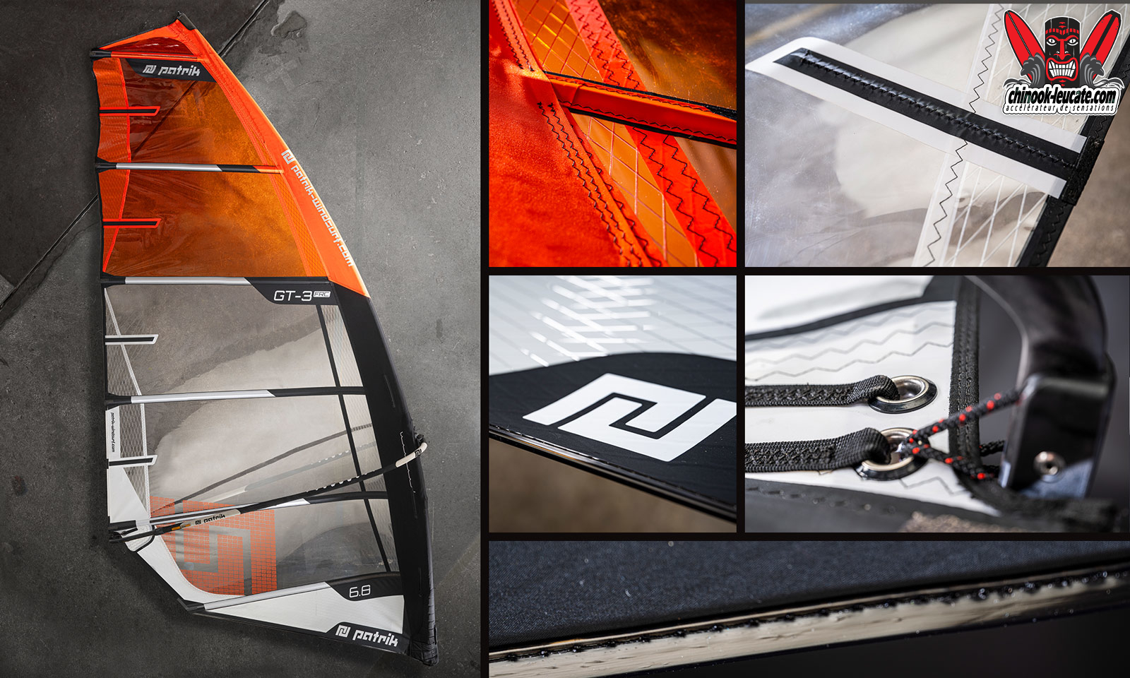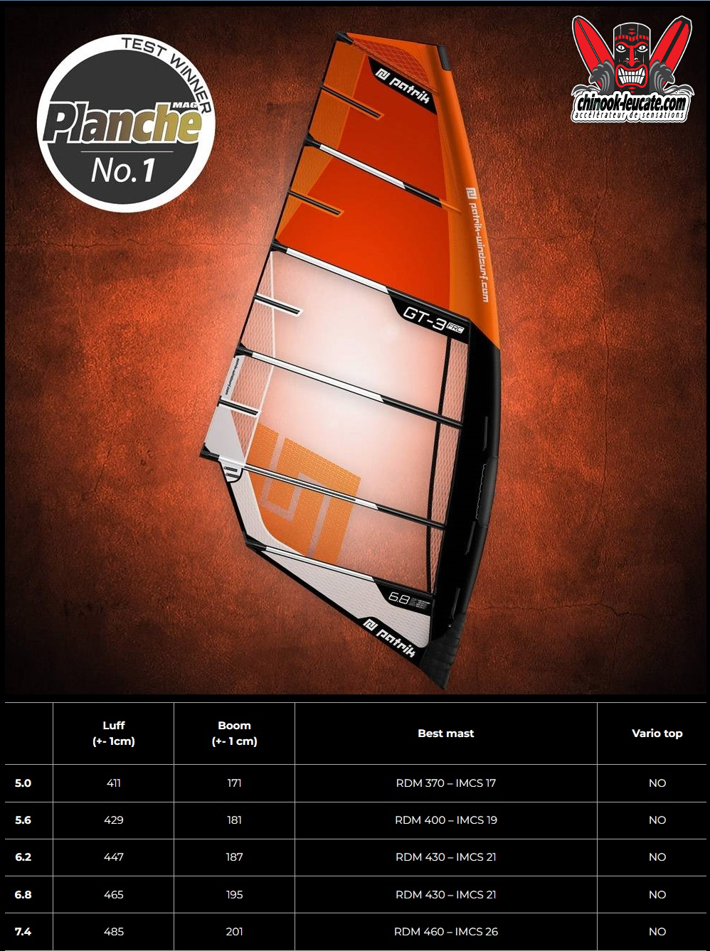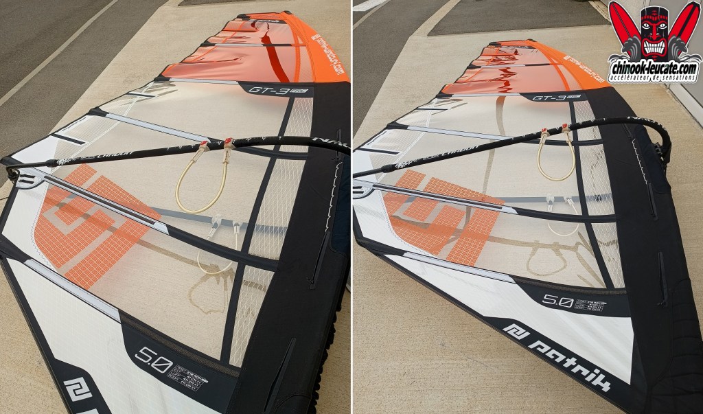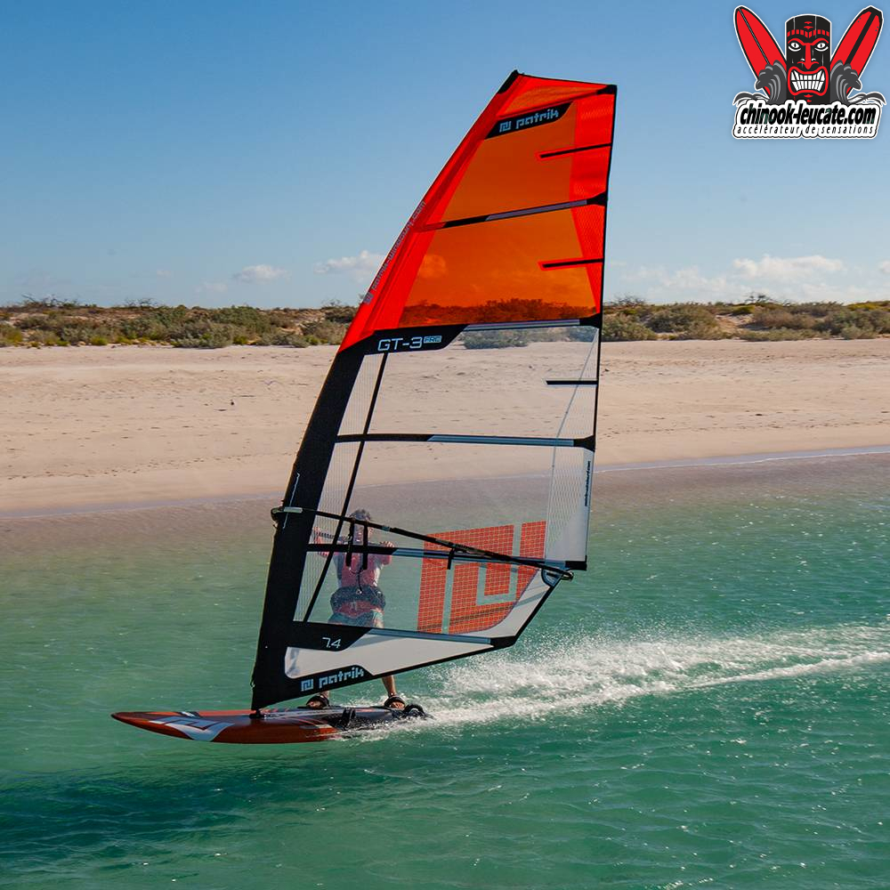 La belle du jour, c’est une Patrik sail GT-3 FRC qui prend le soleil devant le shop. Petite sœur de la voile de slalom RaceSF compétition, la GT-3, c’est un moteur 3 cambers avec une prise en mains proche d’une voile freeride. Douce, accessible et terriblement rapide, elle fera le bonheur des amateurs de freerace qui ne veulent pas se mettre dans le rouge pour bombarder et se régaler. Plébiscitée dans les tests magazines, elle ne demande qu’à vous convaincre et elle est à découvrir au shop ou sur chinook-leucate.com. 🙂