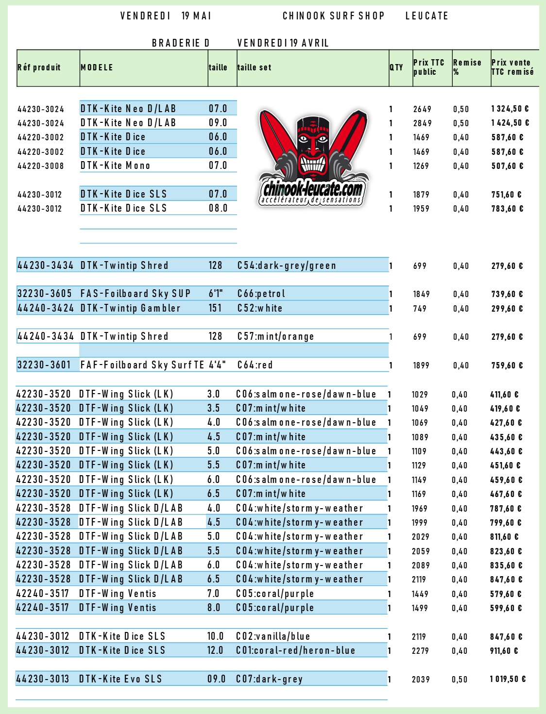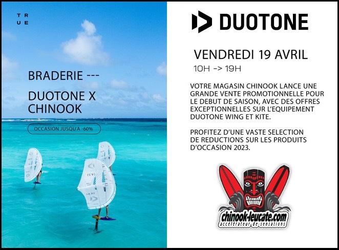 L’info du jour, c’est celle d’une braderie exceptionnelle et qui ne durera QUE ce vendredi 19 avril. Durant les heures d’ouverture du magasin, le matériel test kite et wing Duotone 2023 vous sera en effet proposé à des tarifs très intéressant pour du matériel d’occasion, vérifié et validé avant la vente, qui a servi uniquement durant des journées d’essais. Vous trouverez ci-après l’ensemble des produits et des tarifs remisés avec la possibilité de réserver par téléphone le modèle qui vous intéresse au 04 68 40 17 17. A ne pas rater! 🙂