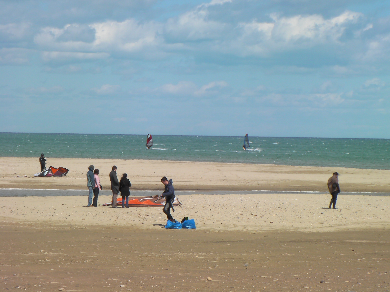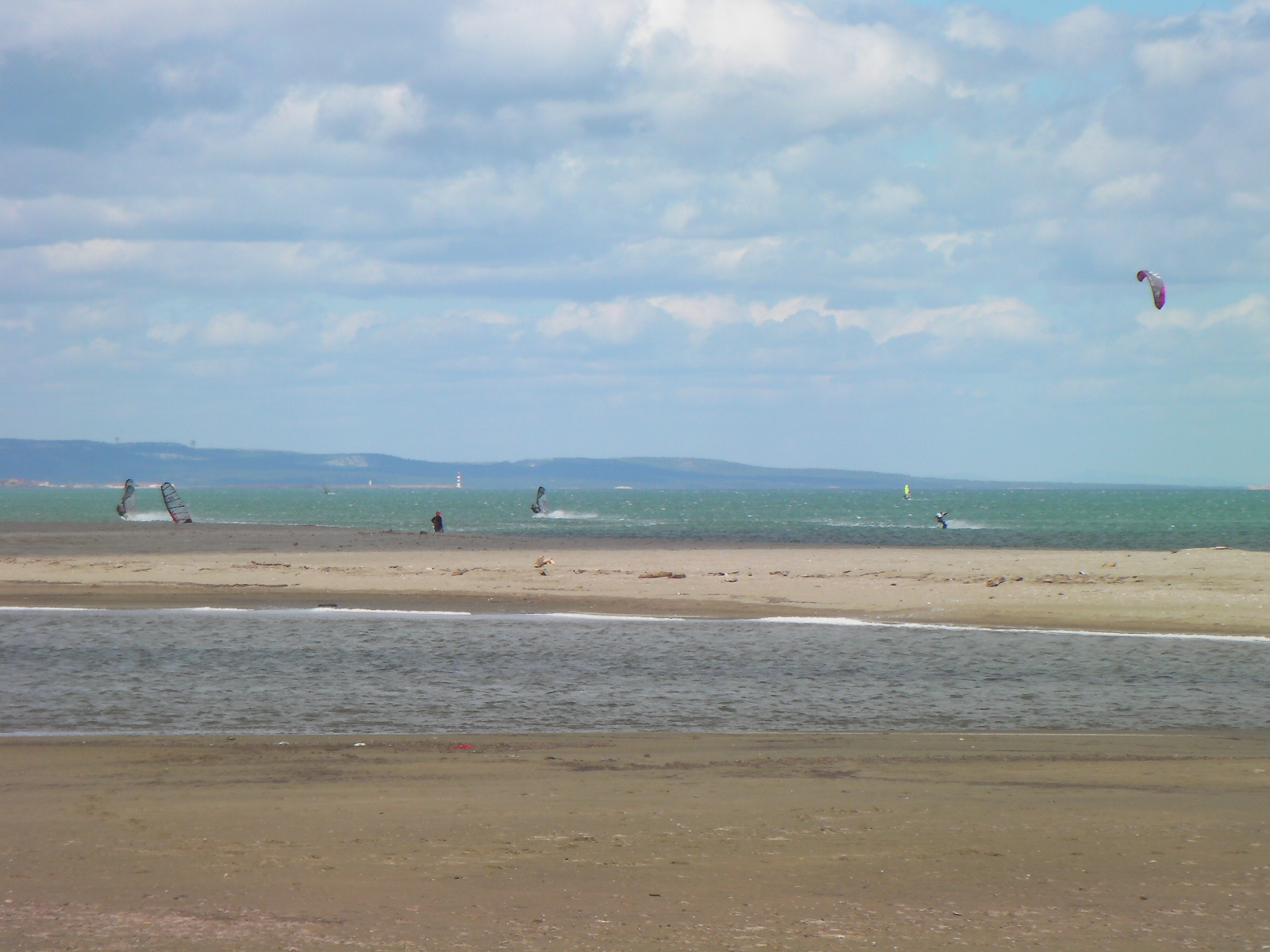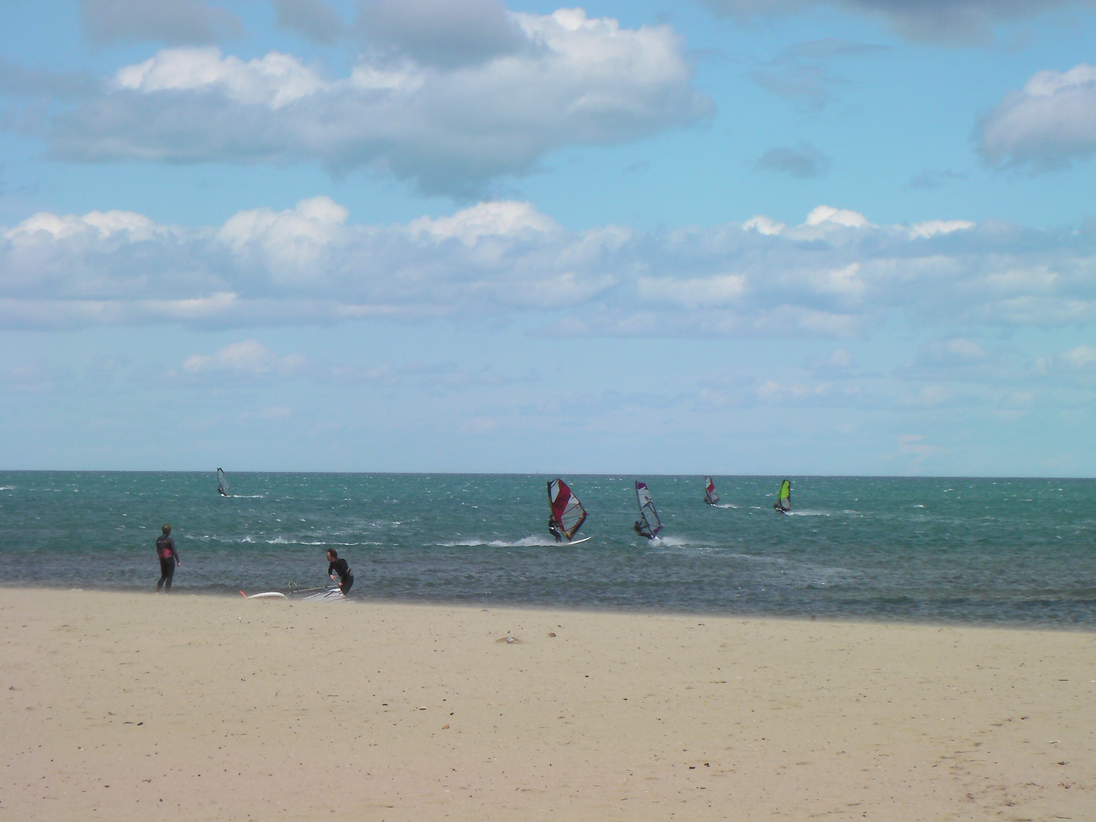 en ces temps de pétole je vous envoie quelques images de jeudi dernier. Alors qu’il y a un petit noeud de Nord-Est sur Leucate, le vent d’Est sud est se renforce sur Argelès. Pile à l’heure, le vent monte à 14 h et soufflera toute la journée en 5.8 m² et 85 litres. Le soleil se montrera rapidement …Nous étions donc deux à naviguer au niveau de Central Windsurf puis, un peux plus tard, Annie et André arriveront à l’entrée d’Argelès, alertés par la webcam 🙂 . Encore une « petite journée » qui dégourdit… Faudrait penser à passer aux choses sérieuses…