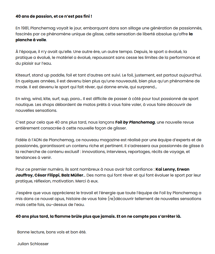L’info du jour, c’est qu’un vent de fraicheur souffle dans le staff de Planche Mag! L’incontournable magazine de windsurf qui nourrit les passionnés de ride depuis plus de 40 ans vient en effet de dévoiler son nouveau bébé: Foil by Planchemag. Comme son nom l’indique, c’est l’actu foil sous toutes ses formes qui sera le carburant de cette aventure dont le n°1 vient tout juste de sortir. Voilà un challenge inédit et plein de promesses pour l’équipe réunie aux côtés du rédacteur en chef Julian Schlosser dont vous pourrez découvrir l’Edito ci-dessous. On leur souhaite bon vol, bonne glisse et beaucoup de succès pour cette belle histoire qui commence. Rendez-vous dans 40 ans ? 🙂