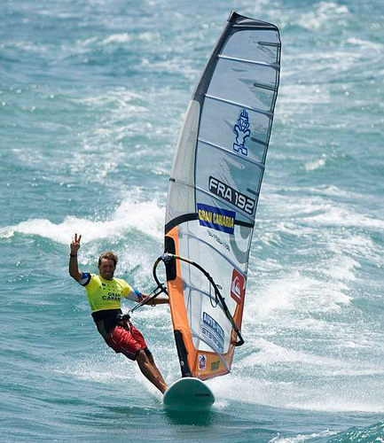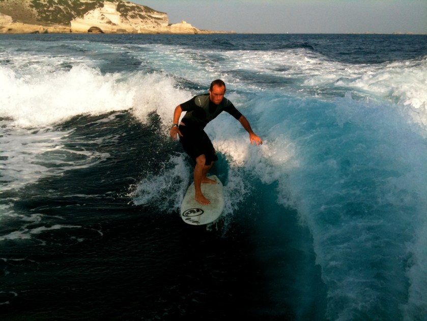 Maintenant, quand y’a pas eu d’air au dealers meeting RRD de l’automne dernier, il fallait le voir surfer la vague d’étrave derrière le yacht de Roberto Ricci…Le sourire aux lèvres, collé au plus près du bateau qui laissait gronder ses deux moteurs diesel de long en large dans cette baie magnifique et préservée. Inoubliable. Un moment rare qui lui fera d’ailleurs dire au sortir de l’eau » purée, s’ils essayaient ça, les écolos, ça leur détendrait un peu plus le gland qu’en faisant du bateau à voile… ». Perspicace, j’vous dis.