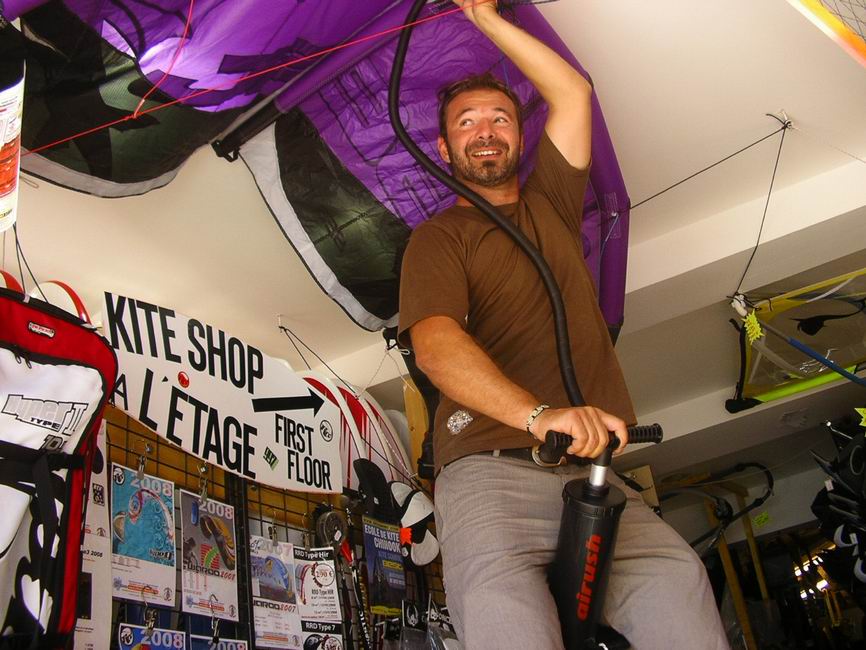 Plutôt connu pour son caractère pondéré, Olivier, le sympathique responsable du rayon kitesurf, n’en est pas moins perspicace. Certes, il sait profiter des conditions de navigation que notre belle région nous offre et aime à varier les plaisirs de la glisse selon ce que Dame Nature accepte de lui offrir chaque jour. Il trie ses déchets et éteint la lumière des chiottes quand il a fini de ruiner l’atmosphère et la tapisserie. Il reste parfois des heures sur la terrasse du magasin, émerveillé, comme subjugué, avec, dans ses yeux remplis de larmes, comme de l’admiration devant le génie des hommes qui ont su capter le vent pour en faire de l’énergie propre grâce à ces éoliennes majestueuses…
