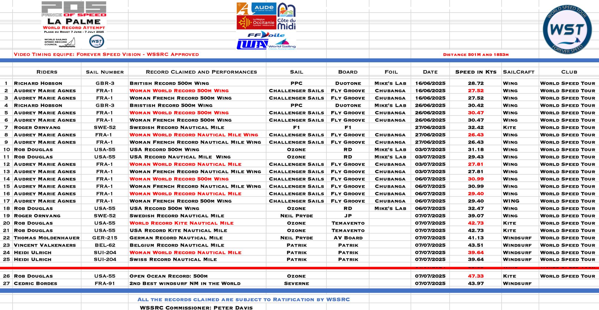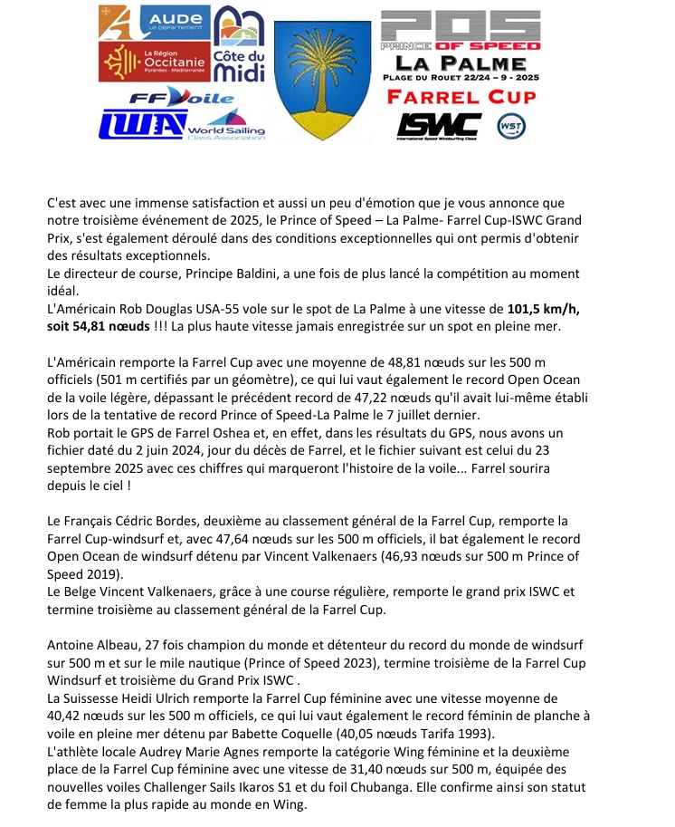 La news de ce samedi, c’est le débrief de la Farrel Cup 2025 qui s’est finalement déroulée pendant 2 jours de tram forte tant attendue! Du vent fort donc, et des records pour la trentaine de riders et rideuses présents en windsurf, kite et wing, ça nous fait un bilan très positif pour l’épreuve organisée par le team Prince of Speed / Principe Baldini dont Chinook était à nouveau partenaire. Communiqué de presse et photos à lire et à voir pour tout savoir. Félicitations à tous les coureurs et à l’organisation! 🙂